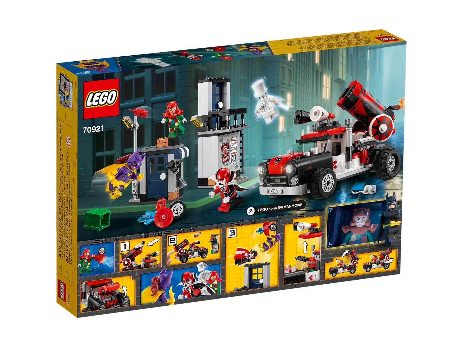 - Wystrzel z armaty na samochodzie, by pomóc Harley Quinn™ przebić się przez drzwi, przewrócić minifigurkę albo latarnię.