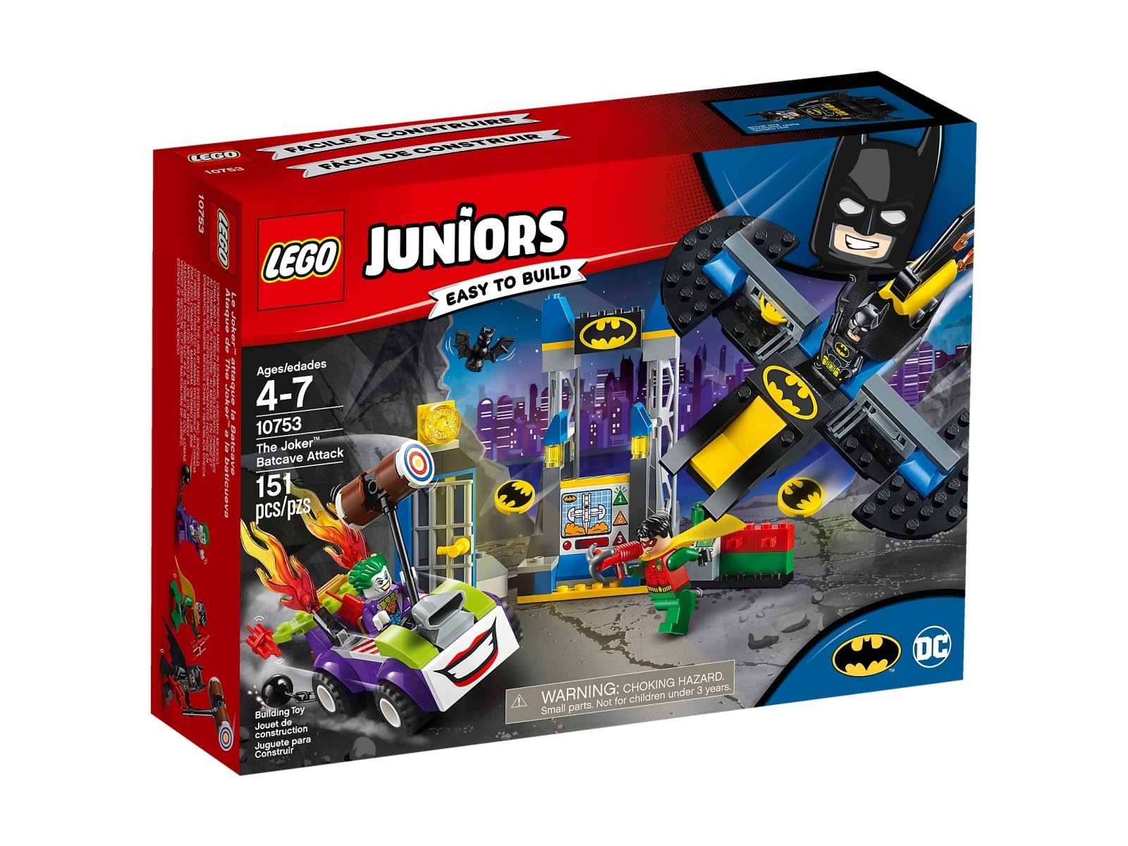 Załóż superbohaterski strój i dołącz do Batmana™ i Robina™, którzy walczą z Jokerem™! W zestawie znajdziesz łatwy do zbudowania odrzutowiec Batwing z uzbrojeniem zamontowanym na skrzydłach, a także zwariowanego hot roda Jokera, jaskinię Batmana z miejscem do zaparkowania Batwinga, celą więzienną i centrum kontroli. Ta ciekawa zabawka konstrukcyjna zawiera proste instrukcje budowania i zabawy. Składanie rozpoczyna się od większych klocków, by mali konstruktorzy poczuli się pewniej. W zestawie są 3 minifigurki.