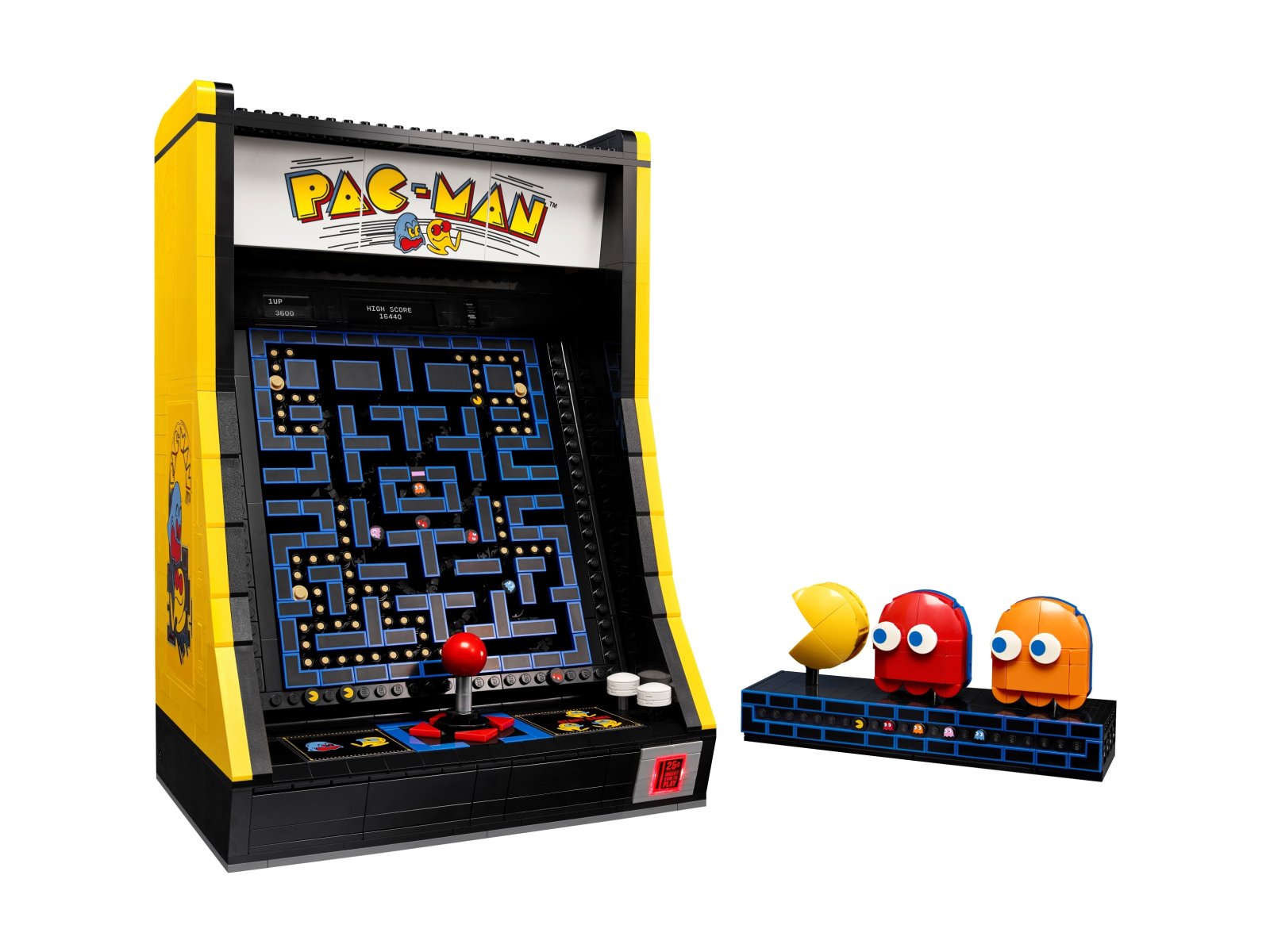 Ta replika LEGO ma mnóstwo detali w stylu retro i zabawnych funkcji, w tym czterokierunkowy joystick i podświetlany otwór na monety. Obróć uchwyt, aby aktywować mechaniczny labirynt, który symuluje klasyczny pościg między ulubionymi postaciami lub otwórz tylny panel, aby zobaczyć mechaniczne elementy. Do zbudowania jest nawet scenka z automatem z lat osiemdziesiątych XX wieku z minifigurką gracza i gablotą z obrotowymi figurkami Pac-Mana, Blinky’ego i Clyde’a.