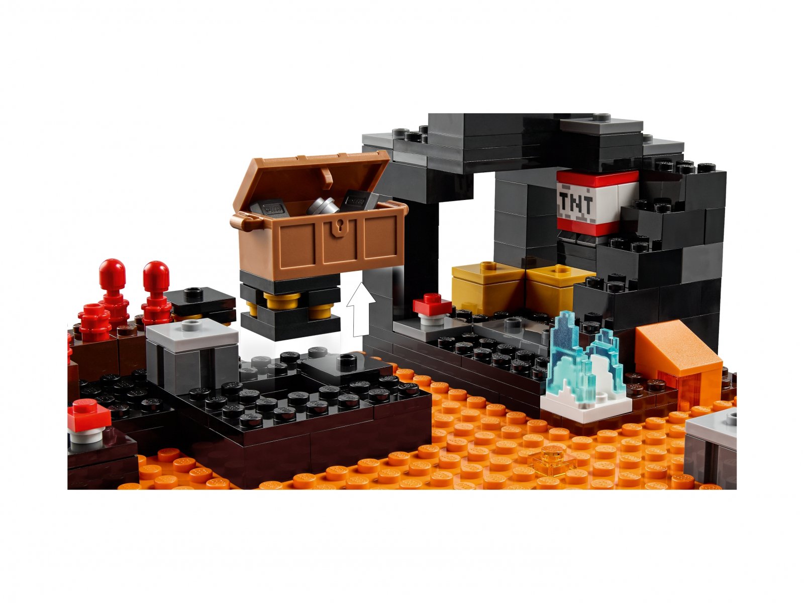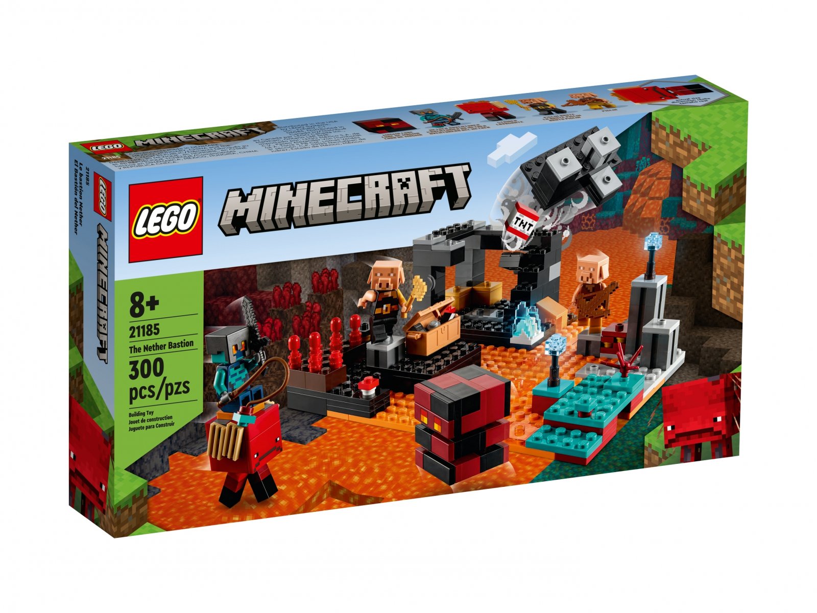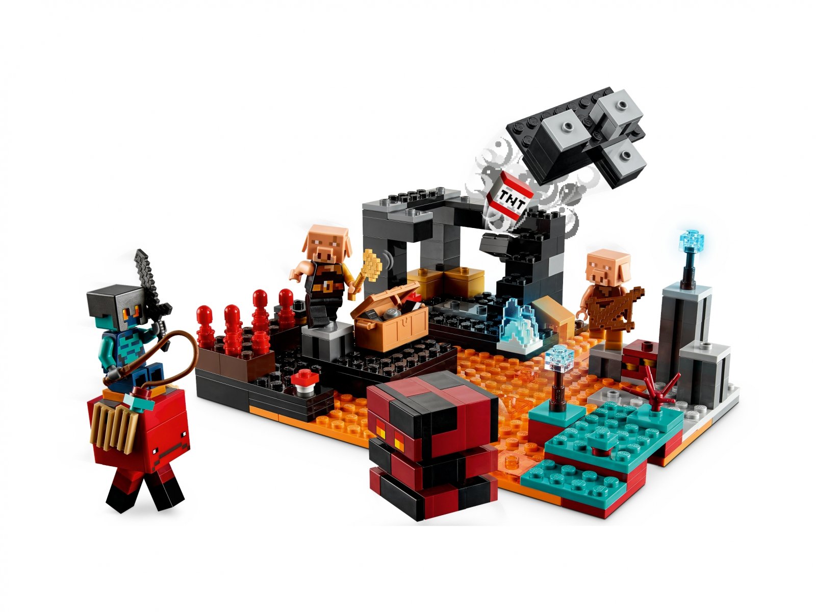 W trakcie podróży do bastionu w ognistym Netherze gracze będą walczyć z przeciwnikami i zmierzą się z licznymi wyzwaniami, po drodze zbierając przedmioty zachęcające do jeszcze lepszej kreatywnej zabawy. Wśród znanych z Minecrafta postaci znajdują się poszukiwacz przygód z Netheru, kostka magmy, piglin okrutnik, piglin i magmołaz. Zestaw ma kilka specjalnych funkcji, takich jak funkcja wybuchu aktywowana przez umieszczenie bloku TNT w odpowiednim miejscu i naciśnięcie przycisku. Dzieci rozpoznają tu też znane z gry akcesoria, m.in. karmazynowy korzeń, spaczony grzyb, złocony czernit, netherową brodawkę, czerwone grzyby, eteryczne pochodnie, bloki złota, netherowe złoże złota, eteryczny ogień oraz broń — złoty topór, kuszę i netherytowy miecz. W zestawie są również blok TNT, wędka i skrzynia skarbów zawierająca odłamki netherytu, bryłki złota i schab. Zestaw można przebudowywać, aby przeżywać nowe, nieograniczone przygody — zupełnie jak w Minecrafcie.