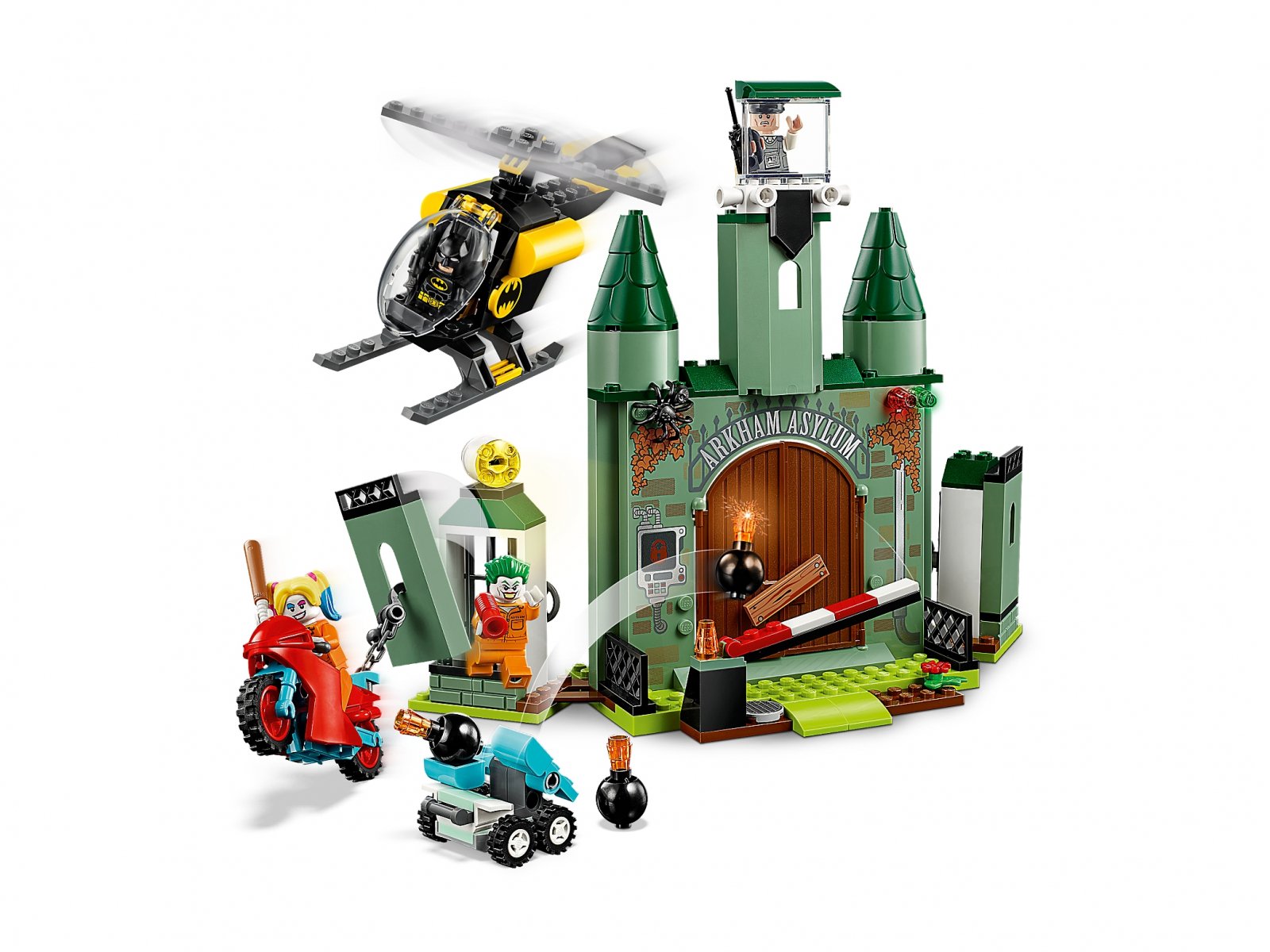 - Azyl Arkham ma otwieraną barierkę, drzwi wejściowe ze zdejmowaną zasuwą, obrotowy szperacz zbudowany z klocków, ekran telewizyjny z wizerunkiem Jokera™ i złożony z klocków panel sterowania z odczepianymi kajdankami. W wieży strażniczej stoi siedzenie dla minifigurki, a w każdym z dwóch więziennych skrzydeł jest otwierana cela dla minifigurki. W więzieniu znajdują się również trzy przedmioty należące do przeciwników Batmana: złożony z klocków pojemnik gazu przerażającego Stracha na wróble, zamrażacz Mr. Freeze’a™ oraz kapelusz Pingwina.