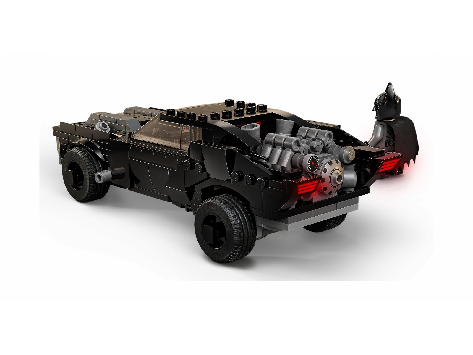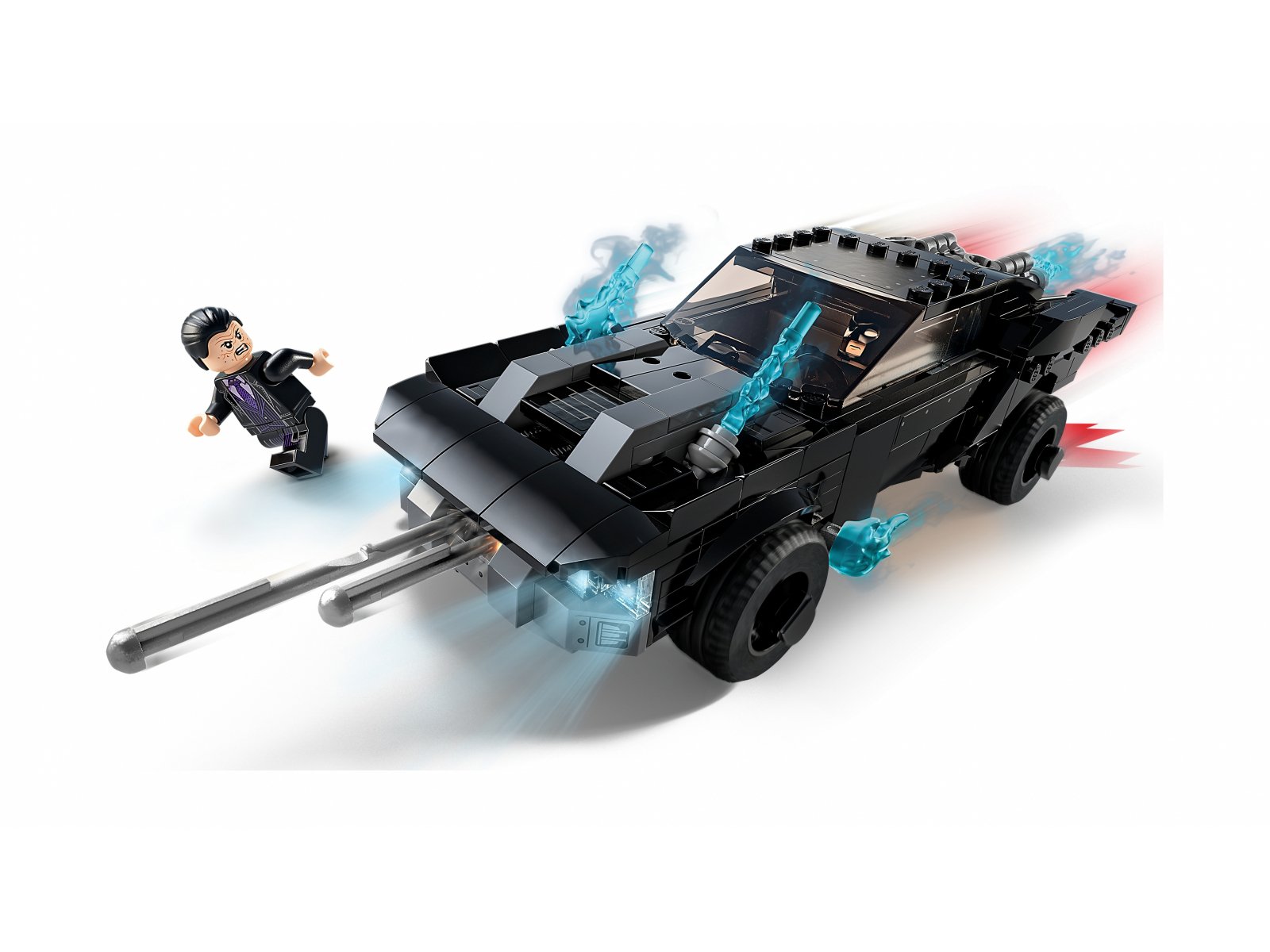 Batmobil jest gotowy do walki dzięki dwóm działkom sprężynowym, które po naciśnięciu płytek na masce wystrzeliwują z przodu auta dwa ogromne pociski (równocześnie lub po kolei). Szybę przednią i dach można podnieść, by posadzić minifigurkę Batmana za kierownicą. W środku jest nawet miejsce dla pasażera! Akcję podkręcają niebieskie płomienie, które można doczepić do rury wydechowej. W zestawie są dwie minifigurki: Batman w materiałowym płaszczu oraz Pingwin z miotaczem i ręczną wyrzutnią rakiet, która ma wbudowany miotacz okrągłych klocków. Po zakończeniu pomysłowych przygód z superbohaterem wielofunkcyjny pojazd można postawić na półce, by był atrakcyjną ozdobą dziecięcego pokoju.