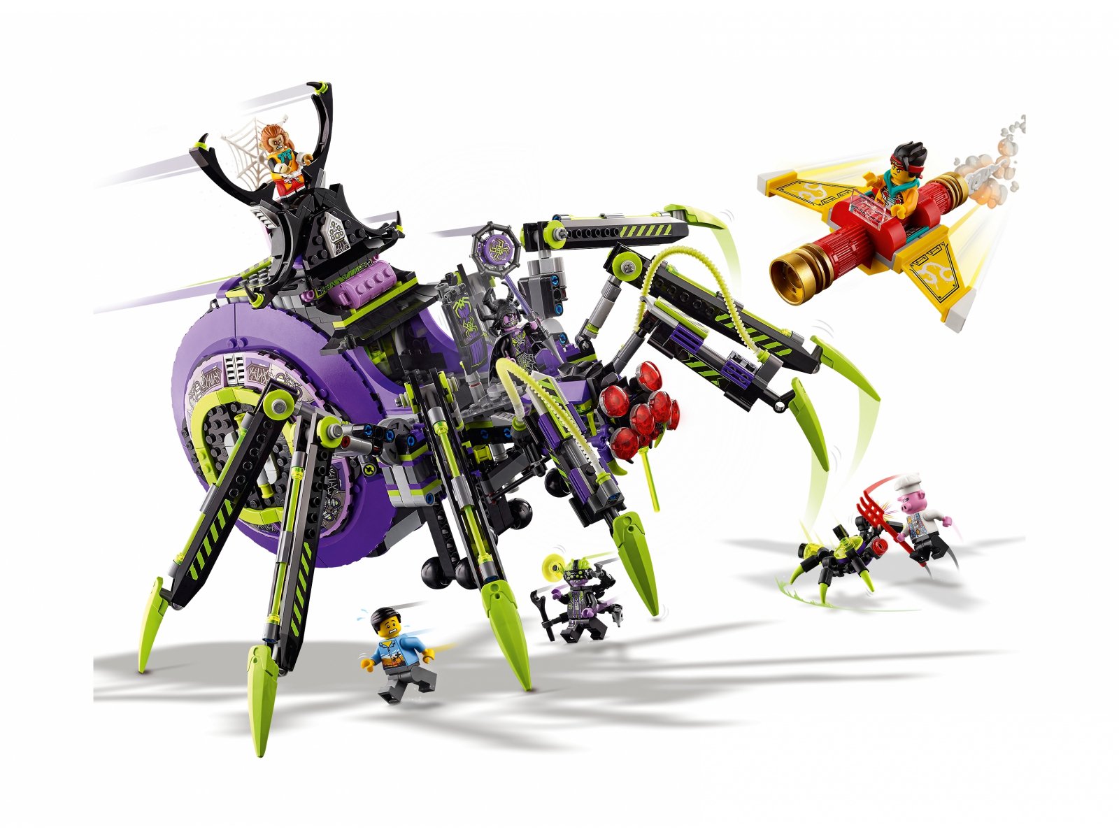 - W komplecie sześć minifigurek — Spider Queen, Syntax, Monkie Kid, Pigsy, Monkey King oraz mieszkaniec miasta — a także broń i akcesoria, w tym Złoty Kostur zmieniający się w latający pojazd Monkie Kida.