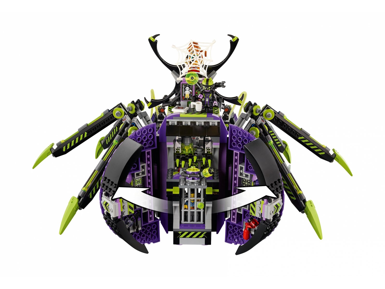 - Mech Spider Queen to jednocześnie mobilna kwatera główna — atakuje szczypcami,które uruchamia się za pomocą dźwigni, i ma korpus, który po otwarciu ukazuje laboratorium z różnymi detalami oraz więzienie dla minifigurki.