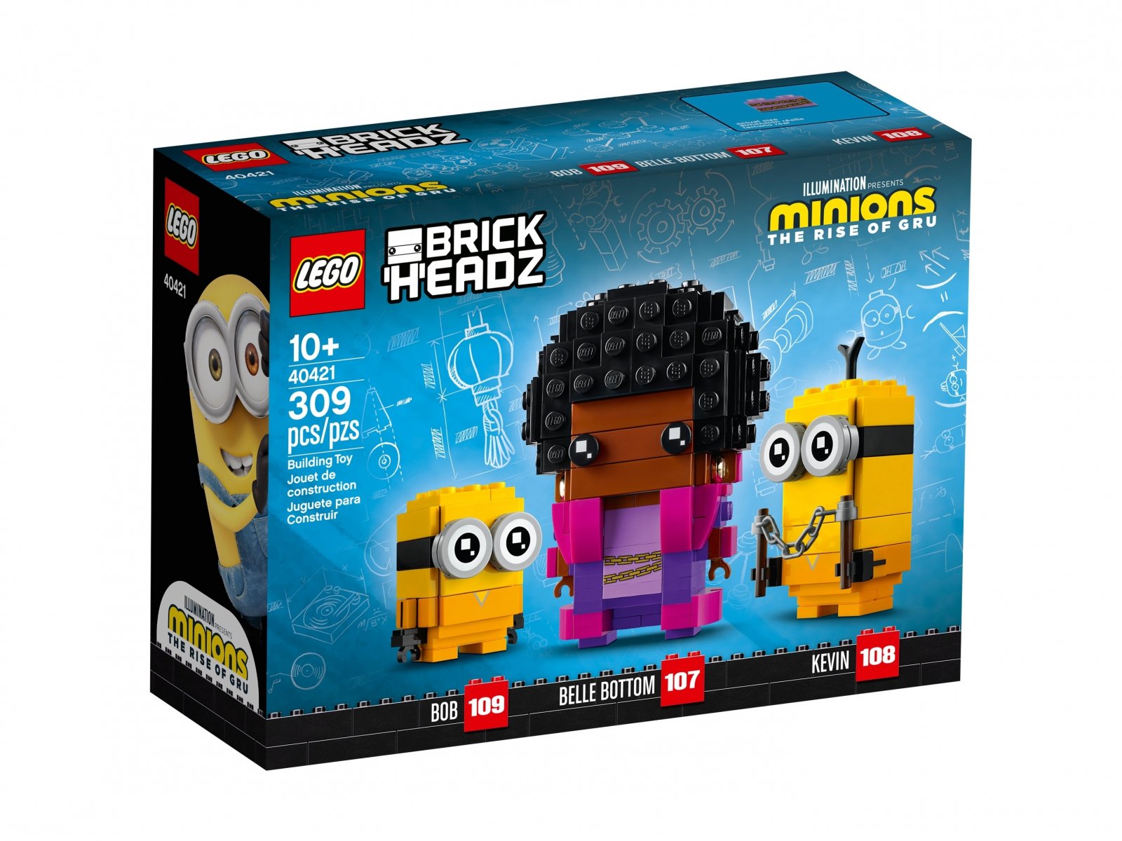 W zestawie LEGO® BrickHeadz™ Belle Bottom, Kevin i Bob (40421) znajdziesz trzy postacie z filmu o Minionkach: Belle Bottom, Minionka Kevina i Minionka Boba z bronią. Jak zawsze w przypadku modeli z kolekcji LEGO BrickHeadz, każda z trzech figurek ma tabliczkę z informacjami o postaci i solidną płytkę, która pozwala ją wyeksponować — osobno, w grupie lub razem z innymi modelami BrickHeadz.
