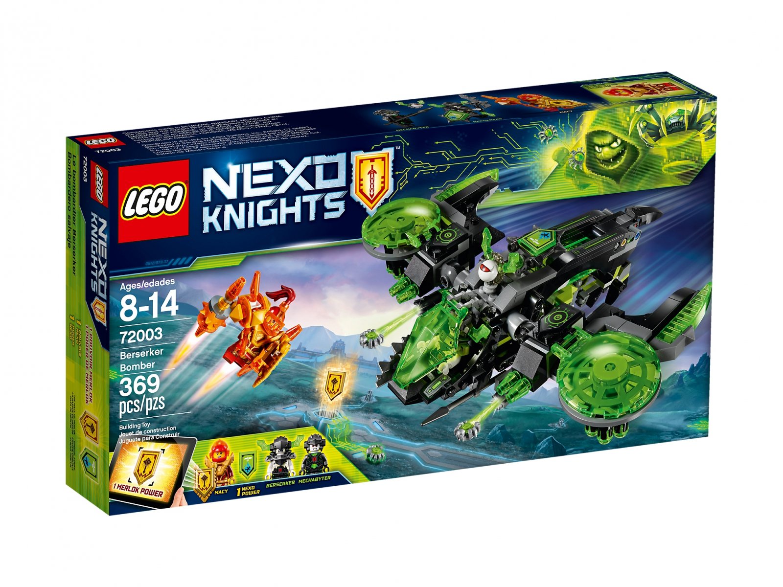 Przygotuj się na podniebną akcję z Bombowcem Berserkera. Samolot ma odczepiane skrzydlate oko, dwa miotacze infekcji na sześć klocków, ruchome skrzydła oraz odczepianą Zbroję Vyro dla Mechabajtera. Załóż plecak odrzutowy Macy i przepędź Berserkera z powrotem do Monstroxa! Ten popularny zestaw dla dzieci zawiera dwie minifigurki, figurkę Mechabajtera i dwie tarcze do zeskanowania.