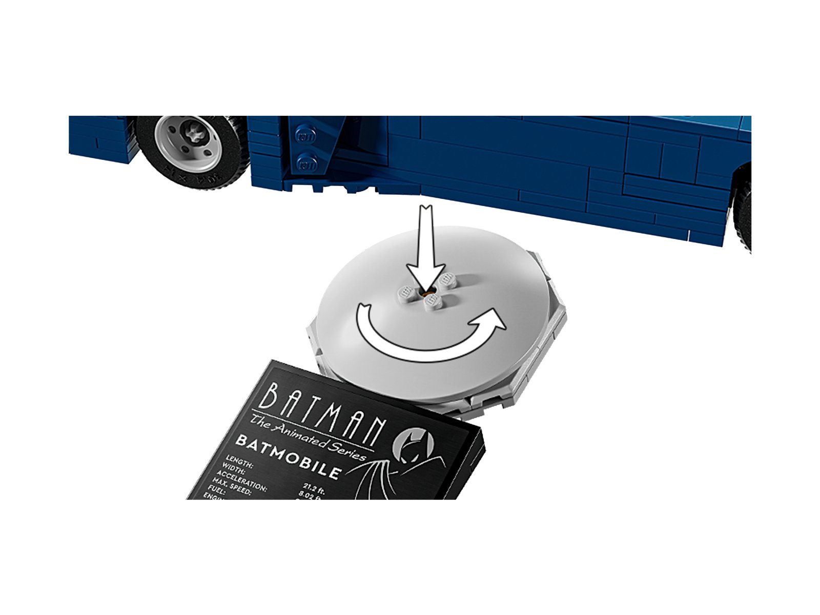 - Obrotowa podstawka do ekspozycji — obrotowa podstawka i tabliczka z napisem umożliwiają eksponowanie kultowego batmobilu LEGO® Batman™