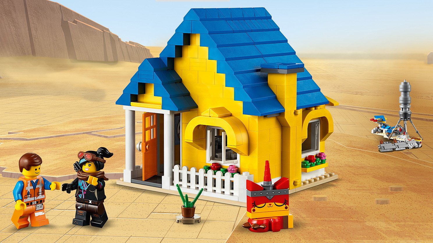 - Dom Emmeta można otworzyć, by ułatwić zabawę w środku. Model wyposażony jest w otwierane drzwi wejściowe, strych, dach, który zdejmuje się podczas zamiany w rakietę, oraz ogród do zbudowania z płotem, beczką i kwiatami. W środku znajduje się salon z kuchnią do zbudowania, sofą, stołem, piecykiem i drapakiem dla Kici wojowniczej, a także różne akcesoria: talerz, kubek kawy, patelnia, radio, lornetka, akordeon i lampy do sterowania ruchem lotniczym.