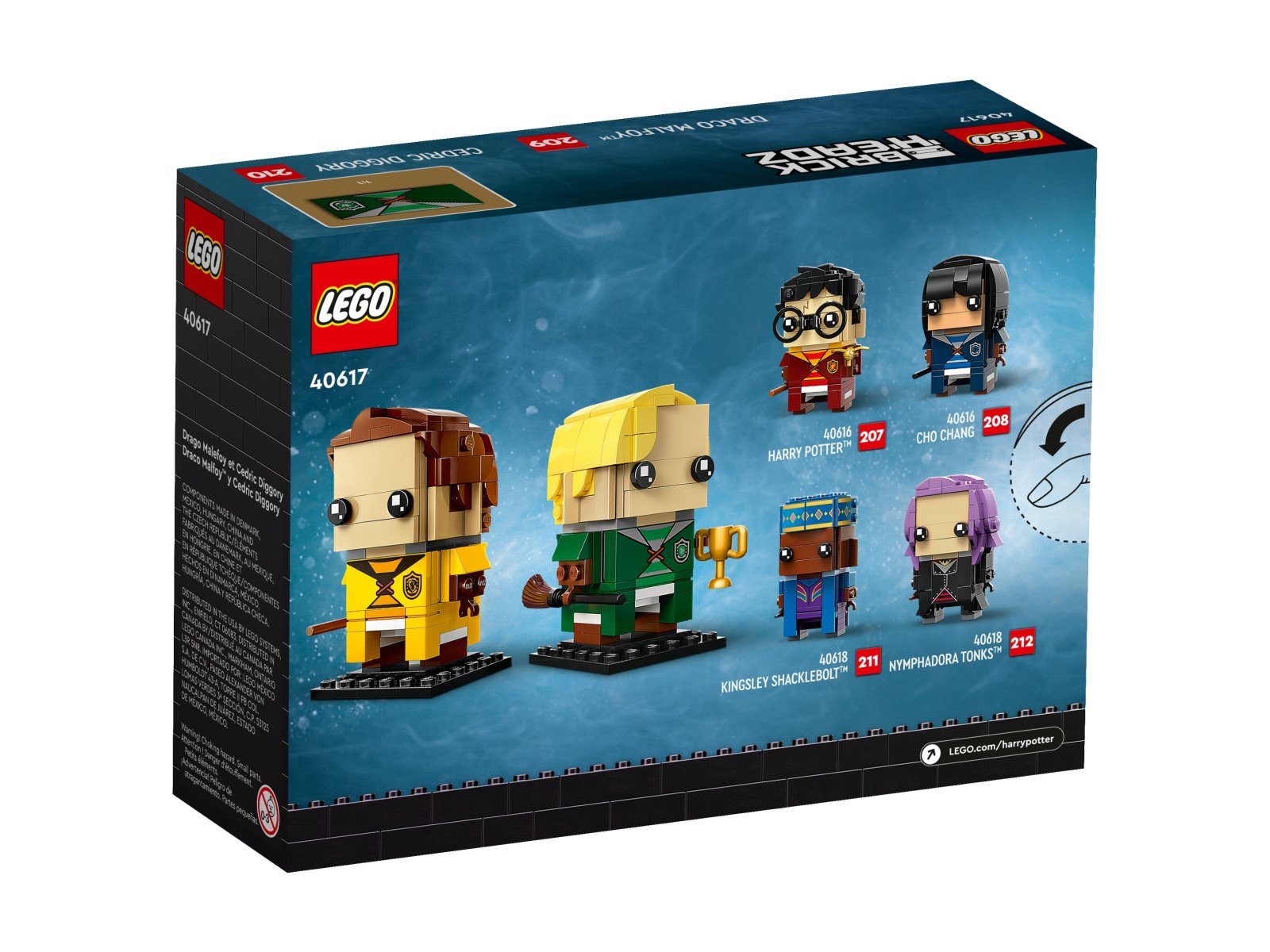 - Draco Malfoy™ i Cedric Diggory w stylu LEGO® BrickHeadz™ (40617) — zbuduj dwie postacie w domowych strojach do quidditcha™ i ustaw je wraz z pucharem domów i dwoma miotłami
