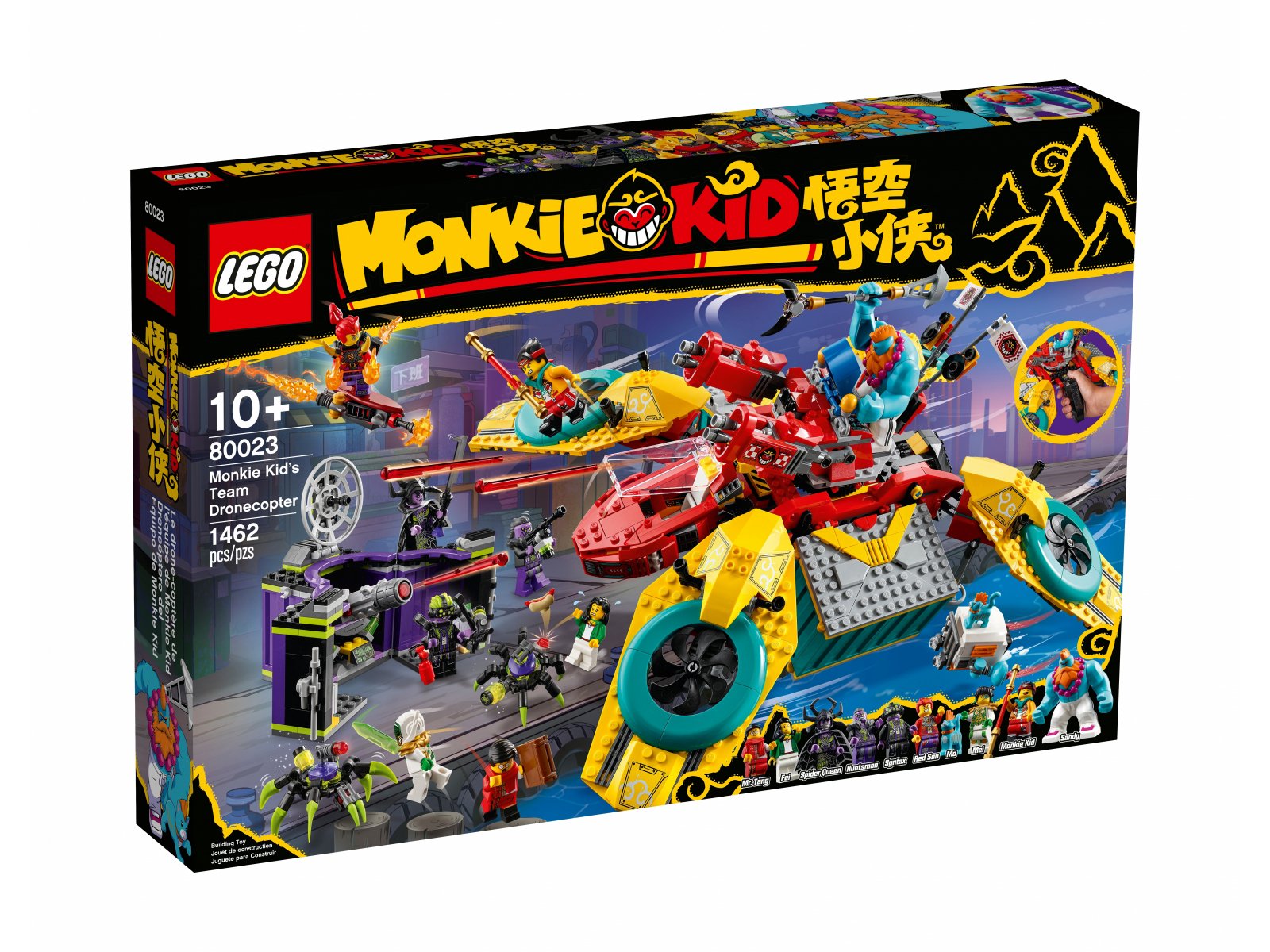Dzieci mogą wcielać się w bohaterów samodzielnie wymyślanych opowieści oraz zbudować dronkopter ekipy Monkie Kida, którego wszyscy będą im zazdrościć. Zabawkowy helikopter z zestawu LEGO® Monkie Kid™ (80023) ma dwa sprężynowe działka i dwa odłączane kontenery na towar z mnóstwem elementów domowego wystroju w środku — są tam nawet łóżka piętrowe i automat do gry (do zbudowania). W pudełku na dzieci czeka także sprężynowa wyrzutnia zatrutych pocisków oraz osiem minifigurek i dwie figurki, w tym Monkie Kid, Mei, Sandy, kot Mo, Spider Queen, Mr. Tang z klockiem udającym książkę „Wędrówka na Zachód” oraz Red Son z latającym pojazdem.