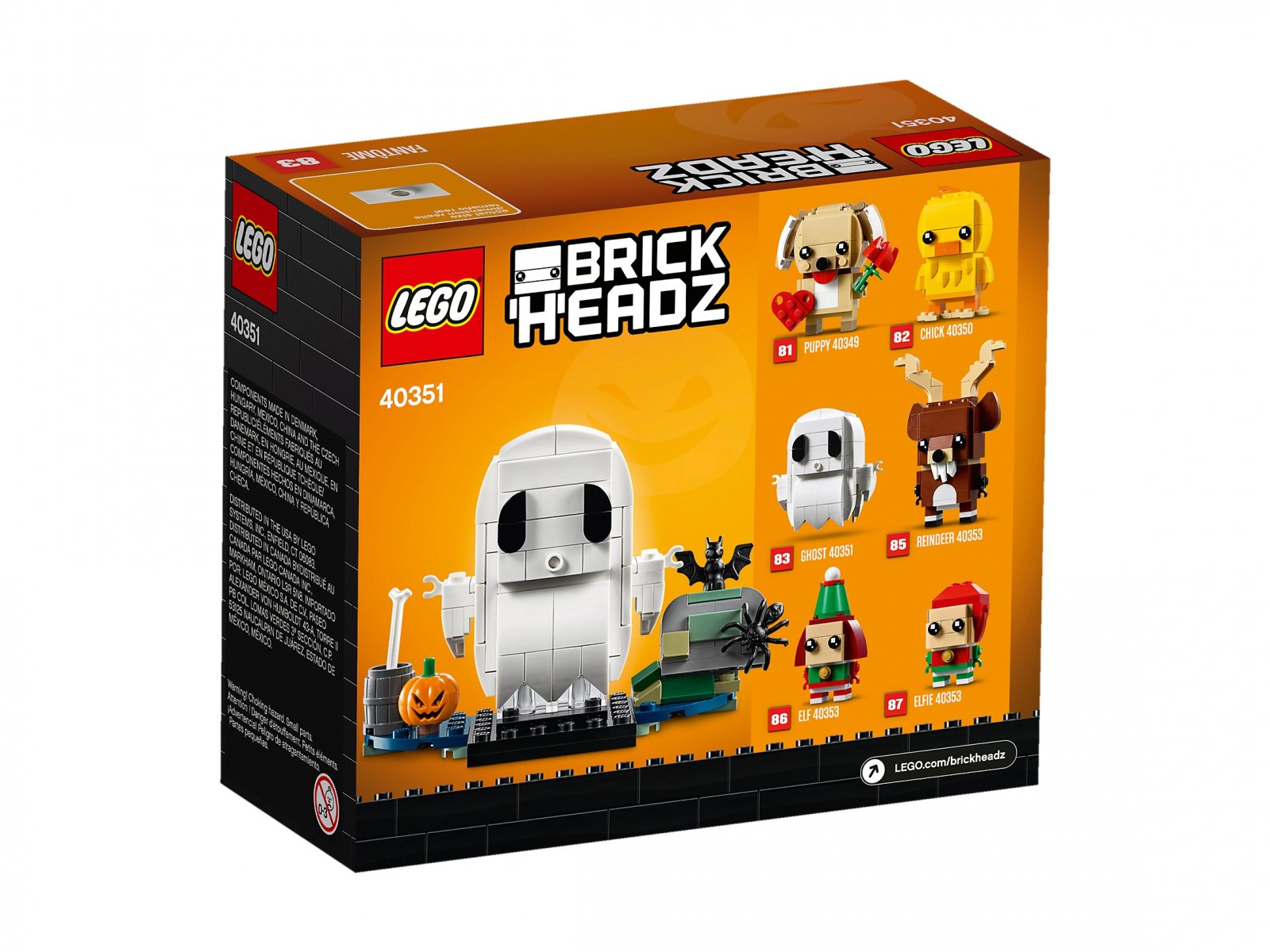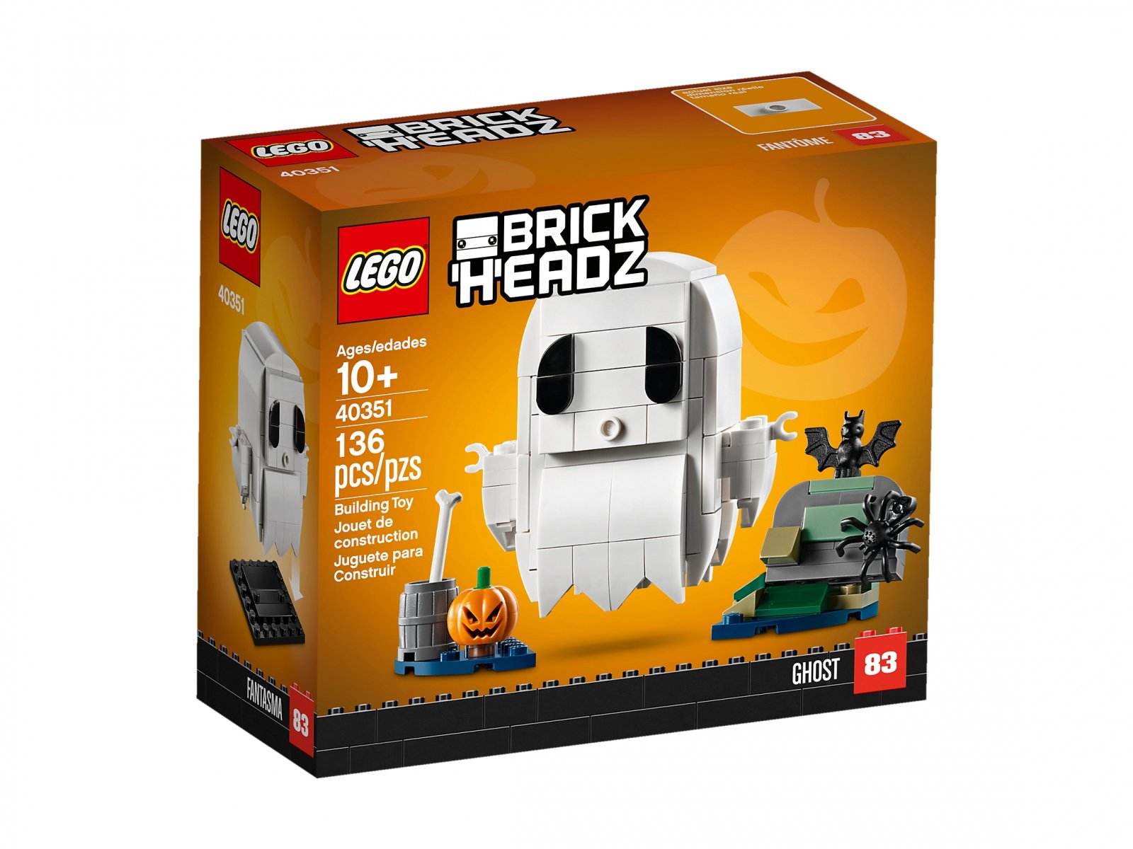 Zbuduj i ustaw na półce figurkę LEGO Brickheadz™ 40351 Duch na Halloween, by uzupełnić swoje halloweenowe dekoracje o odrobinę stylu LEGO®. Przezroczyste klocki u podstawy figurki sprawiają wrażenie, że duch unosi się w powietrzu. Model stoi pośrodku upiornej halloweenowej scenki z klocków zawierającej nagrobek, lampę zrobioną z dyni, nietoperza i pająka.