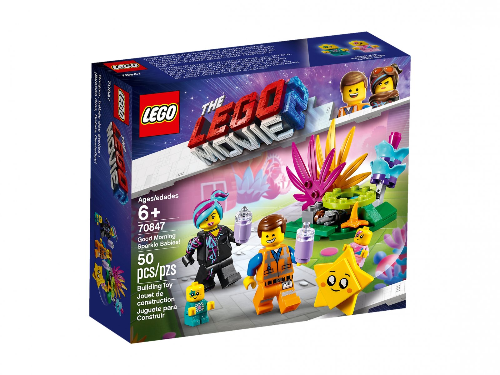 - Zestaw z serii THE LEGO® MOVIE 2™ zawierający minifigurki Emmeta i Lucy, dwie figurki niemowląt (nowość na sierpień 2019 r.) oraz zbudowaną z klocków figurkę Gwiazdki.