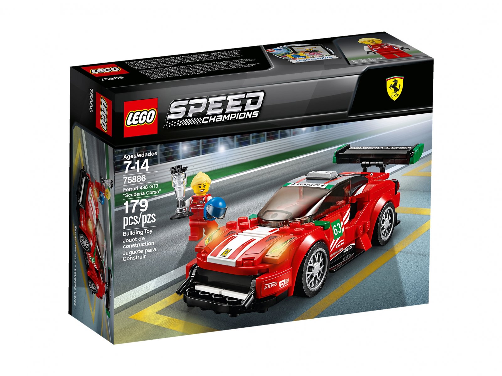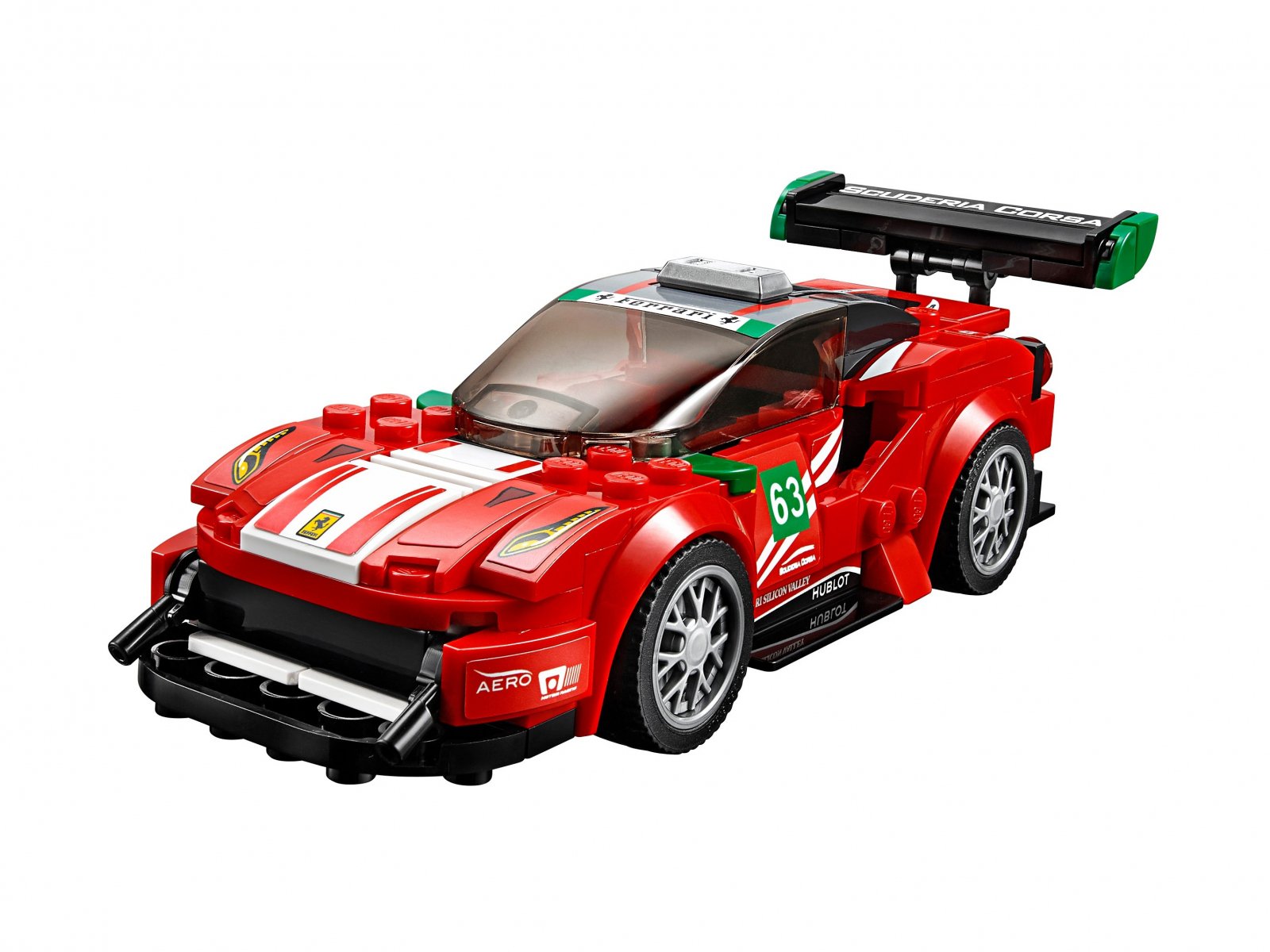 - Ferrari 488 GT3 „Scuderia Corsa” to rasowe auto wyścigowe w realistycznych kolorach. Ma kabinę z miejscem dla minifigurki, zdejmowaną szybę przednią, koła z gumowymi oponami, realistyczne zdobienia i naklejki z wyścigowymi motywami.