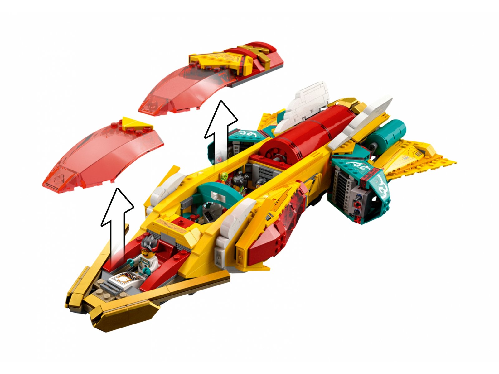 - Niezwykle szczegółowy model statku kosmicznego — ma dwa sprężynowe działka, kokpit dla minifigurki, kabinę z miejscem dla czterech postaci oraz składzik na pierścień zielonego płomienia, plecak odrzutowy i księżycowy łazik