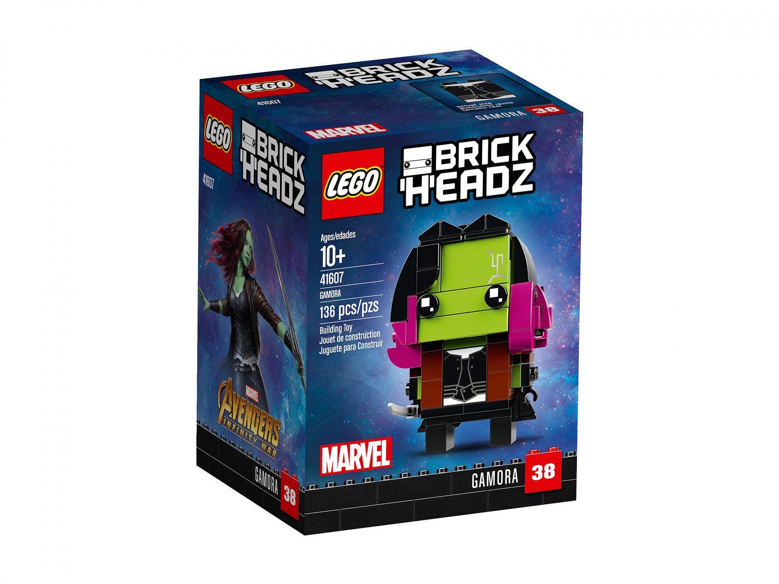 - Figurka Gamory do zbudowania z serii LEGO® BrickHeadz ma oczy BrickHeadz oraz realistyczne detale z kinowego przeboju Avengers: Infinity War, w tym jaskrawozieloną skórę, ciemnoróżowe włosy, obcisły, czarny strój i odczepiany miecz.