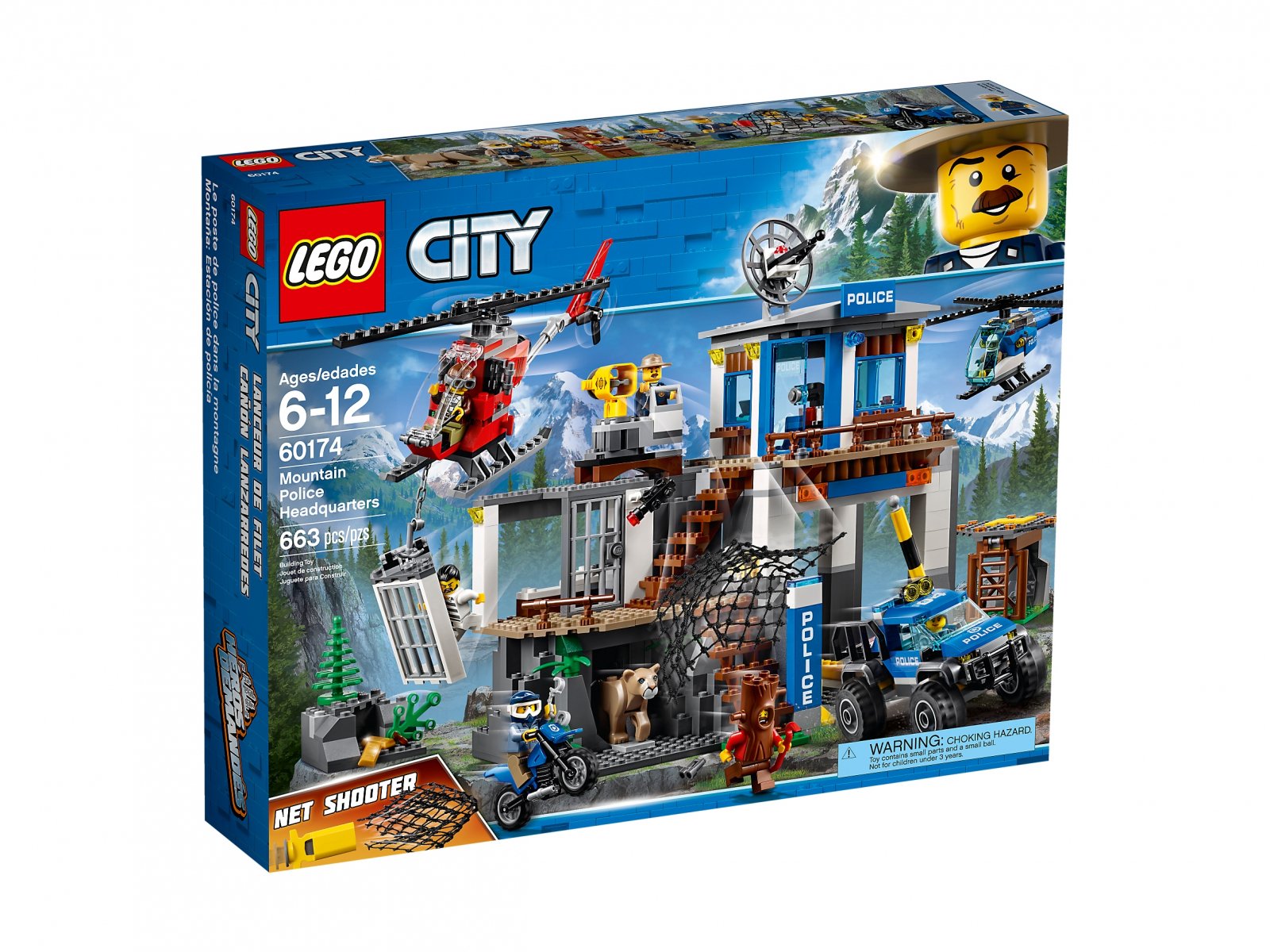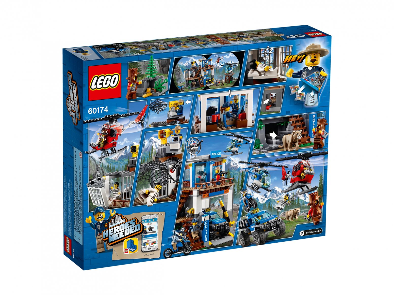 Łap odznakę i wybierz się do głównej kwatery Górskiej Policji LEGO® City, żeby zaaresztować kogo trzeba. W tym niezwykłym zestawie znajdziesz 2-poziomowy budynek policyjnej kwatery głównej z wyrzutnią sieci na dachu i celą, której ścianę lub drzwi można wyłamać. Pod celą znajduje się tez jaskinia, a w niej puma, która skacze na ofiarę. W tym niezwykłym zestawie jest też lądowisko dla helikoptera z drabiną, helikopter policyjny z obracającym się wirnikiem oraz helikopter złodziei, który także ma ruchomy wirnik, a do tego łańcuch z hakiem. Dodatkowo w pudełku znajdziesz policyjny samochód terenowy i motocykl crossowy. Zestaw zawiera 7 minifigurek i figurkę pumy.
