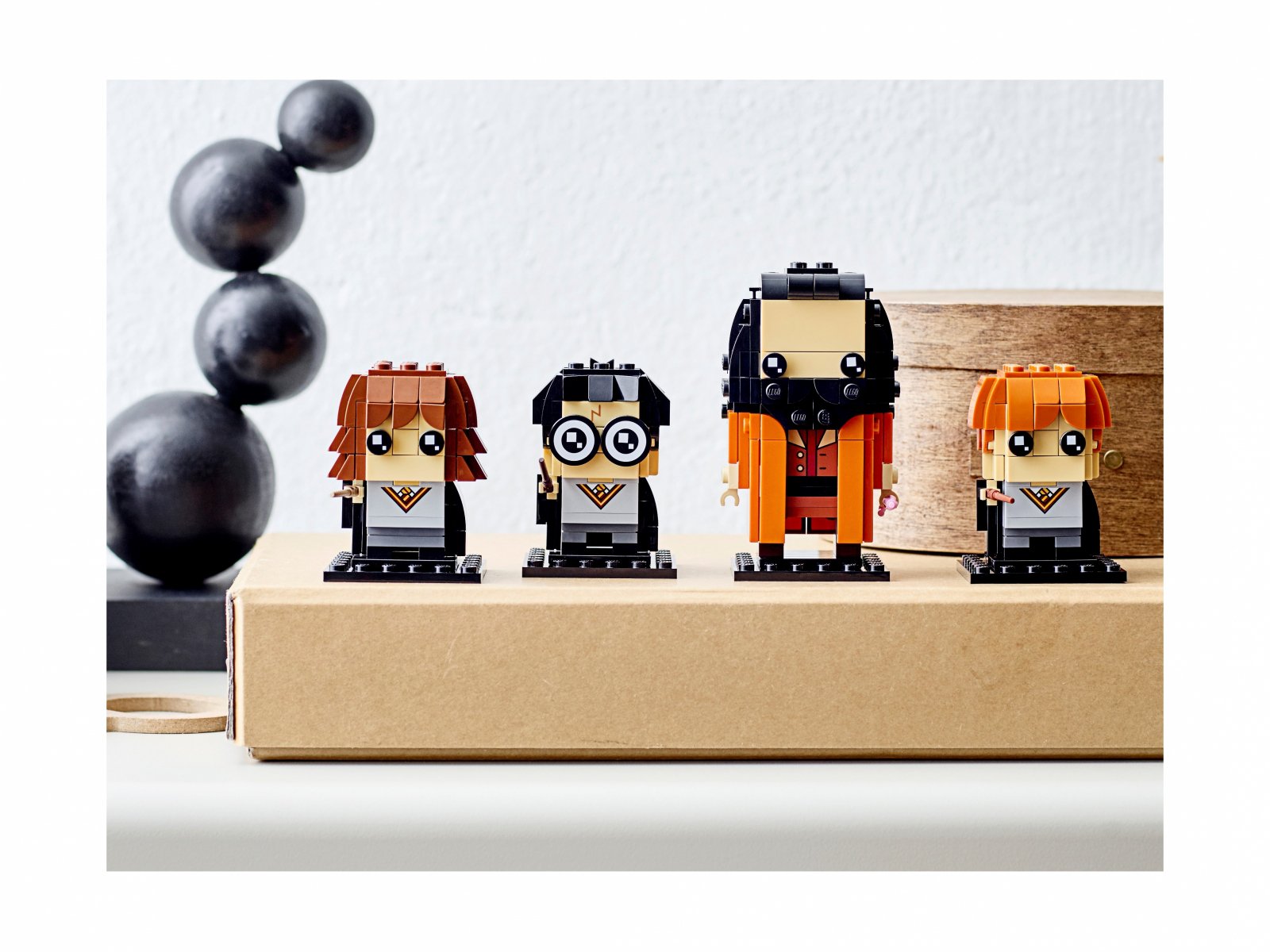 Cztery najbardziej znane postacie z filmów o Harrym Potterze jako modele LEGO® BrickHeadz™: Harry Potter, Hermiona Granger, Ron Weasley i Rubeus Hagrid.