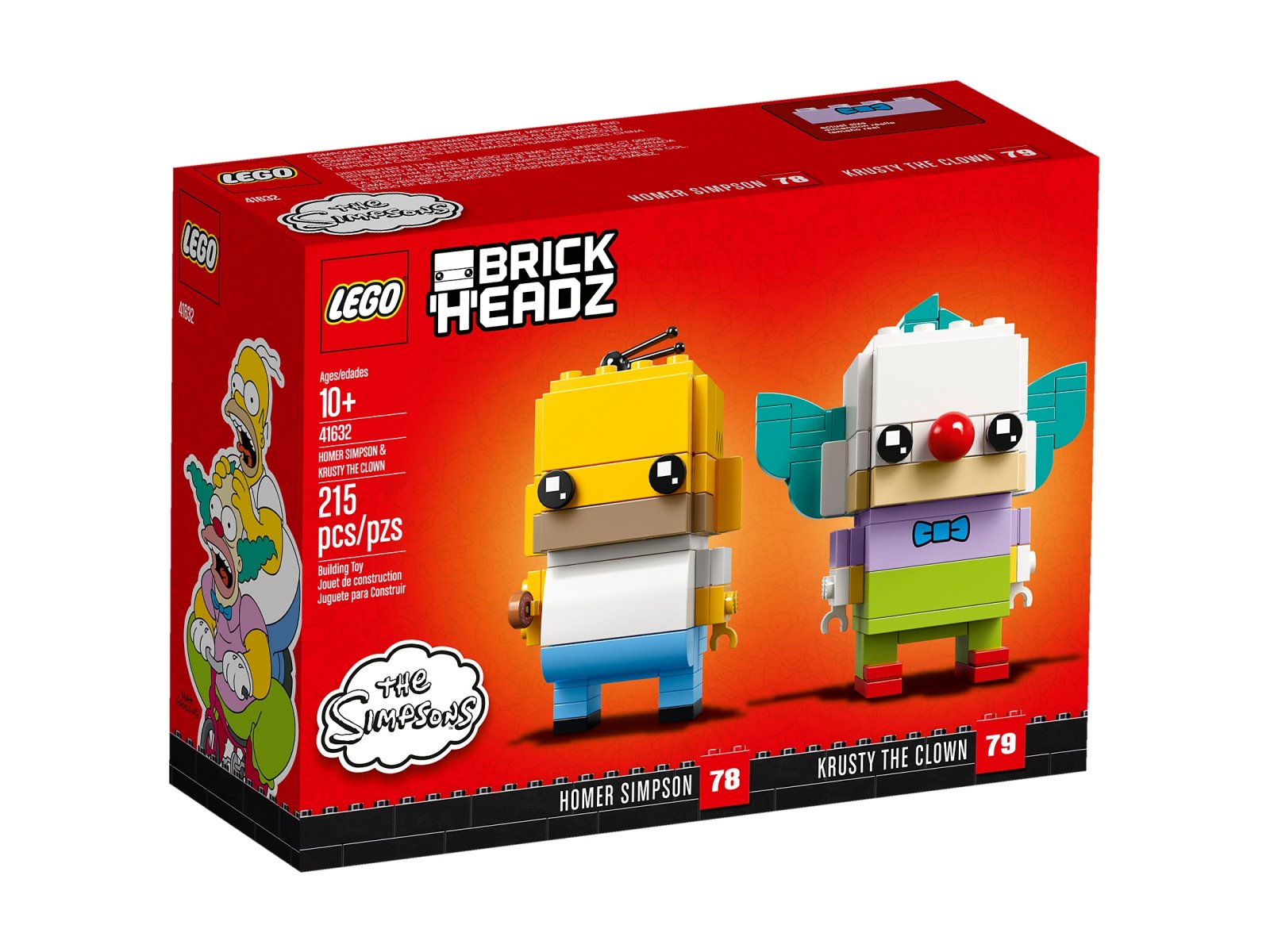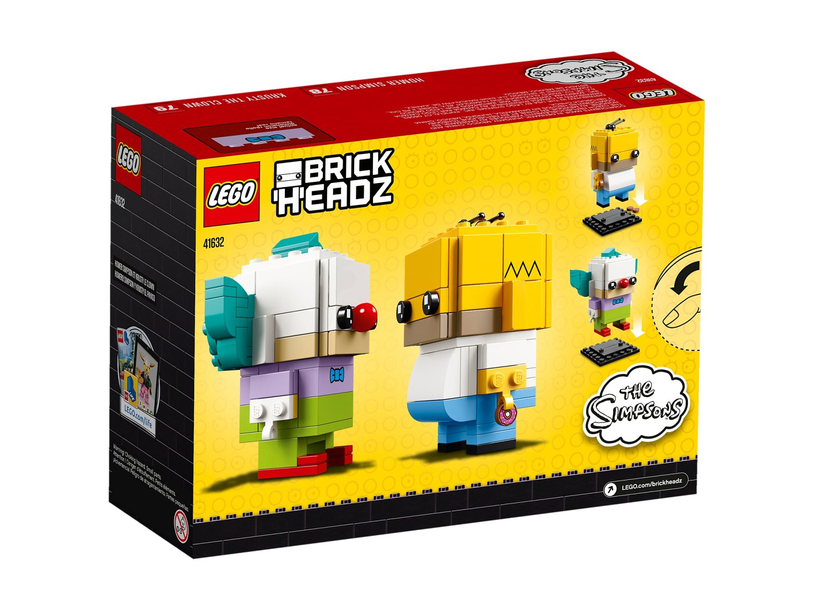 - W zestawie LEGO® BrickHeadz™ 41632 znajdziesz dwie postacie do zbudowania: Homera Simpsona i Klauna Krusty’ego. Obie mają wszystkie charakterystyczne cechy kultowych bohaterów serialu Simpsonowie™, wraz z łysą głową Homera i jego nieodłącznym różowym pączkiem oraz przezabawną zieloną fryzurą i czerwonym nosem Krusty'ego.