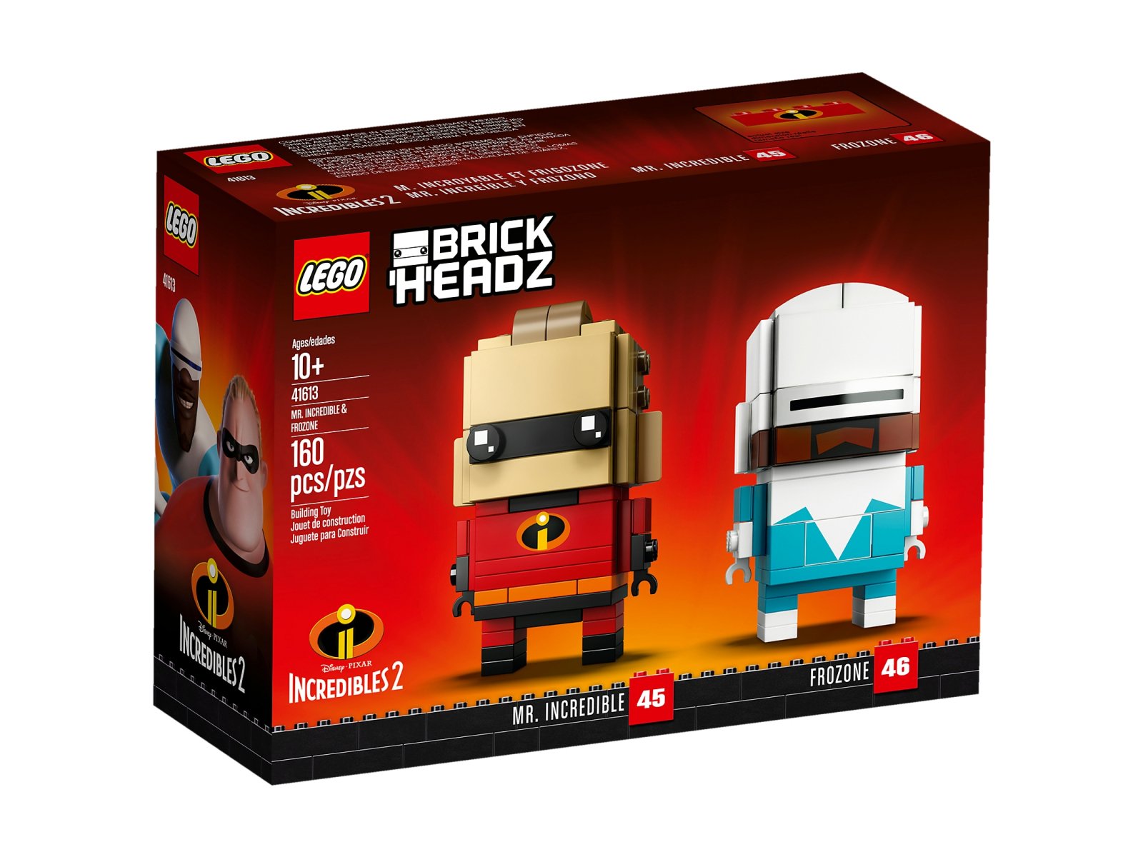 - Figurki Pana Iniemamocnego i Mrożona do zbudowania z serii LEGO® BrickHeadz™ mają oczy BrickHeadz i kultowe kostiumy superbohaterów z filmowego hitu wytwórni Disney