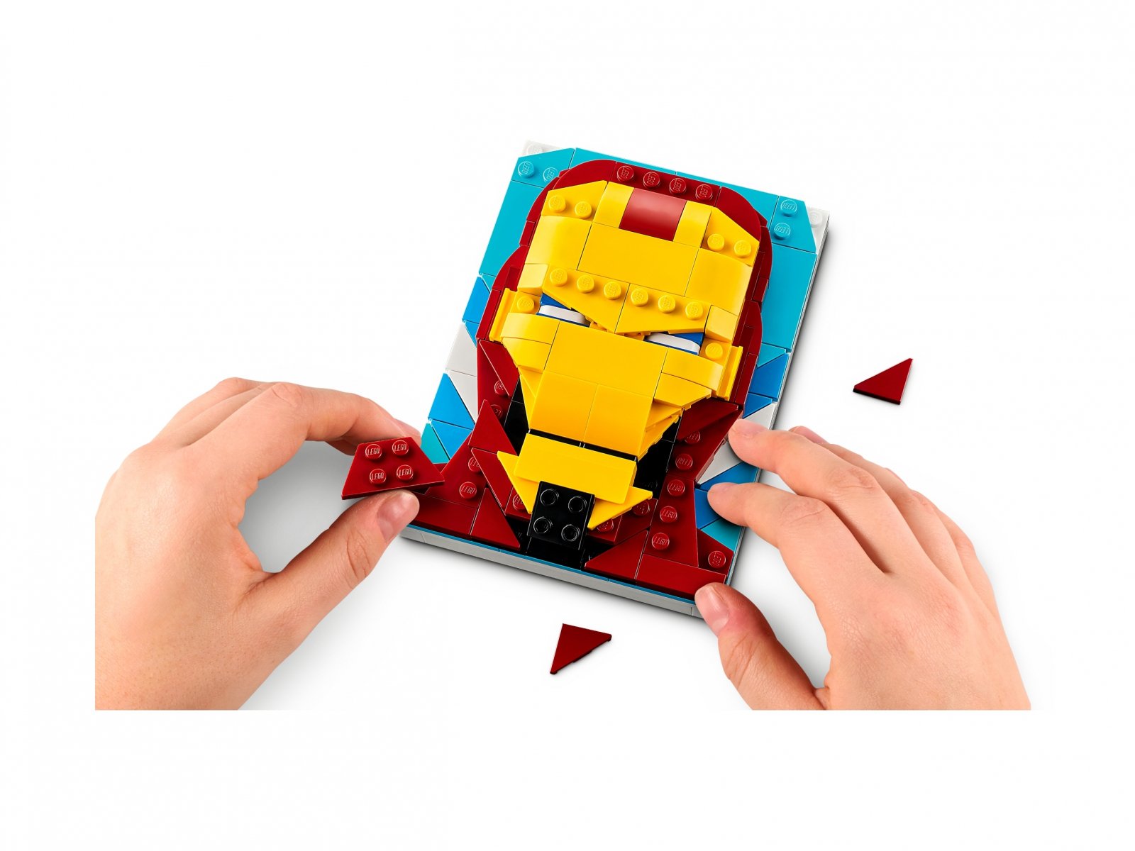 - Ilustracja przedstawiająca Iron Mana — młodzi superbohaterowie i konstruktorzy LEGO® mogą zbudować i wyeksponować kolekcjonerski portret Brick Sketches™ słynnego noszącego zbroję Avengera
