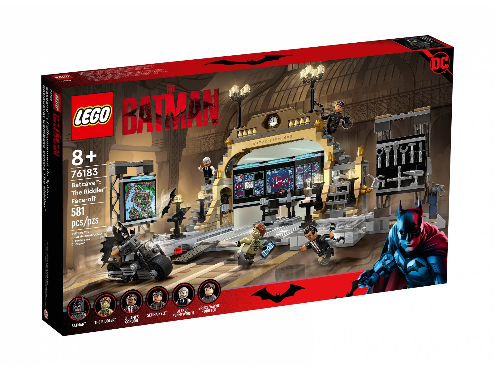 W Jaskini Batmana znajdziesz komputery, narzędzia i spawarkę do naprawy pojazdów. Boczne ściany są zamocowane na zawiasach, więc można je obracać pod różnymi kątami, by mieć więcej miejsca na zabawę. Na jednej z nich wisi duży plan miasta GOTHAM CITY™, a na drugiej stelaż na narzędzia. W zestawie jest też sześć minifigurek z filmu „Batman”: Batman, Selina Kyle™, Człowiek-Zagadka, Drifter, Alfred i komisarz Gordon. Specjalną lupą dzieci mogą odczytać zakodowane wskazówki z trzech elementów zostawionych przez Człowieka-Zagadkę. Gdy Batman wyruszy w miasto na swoim motocyklu, może przebrać się za swoje alter ego — Driftera. A jeśli wróci ze schwytanym złoczyńcą, może zamknąć go w więzieniu w swojej jaskini. Na koniec może wjechać na rampy naprawcze Batmobilem™ z zestawu Batmobil: pościg za Pingwinem™ (76181, sprzedawany oddzielnie).
