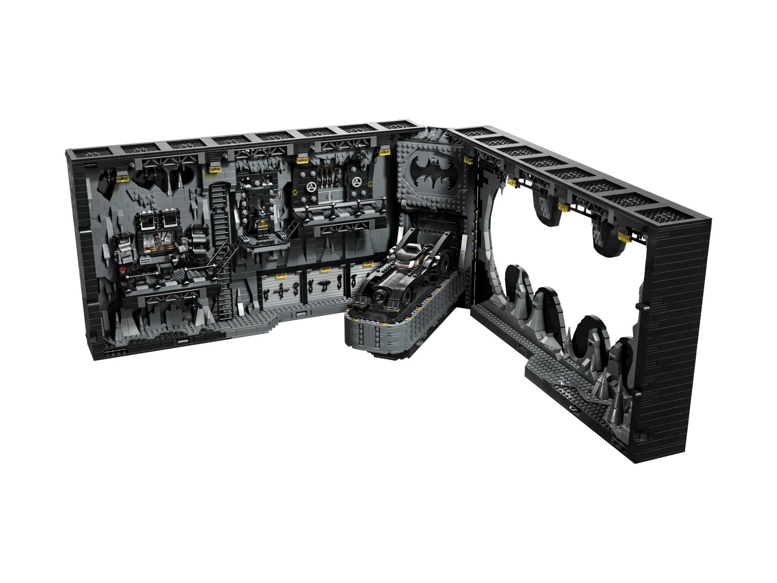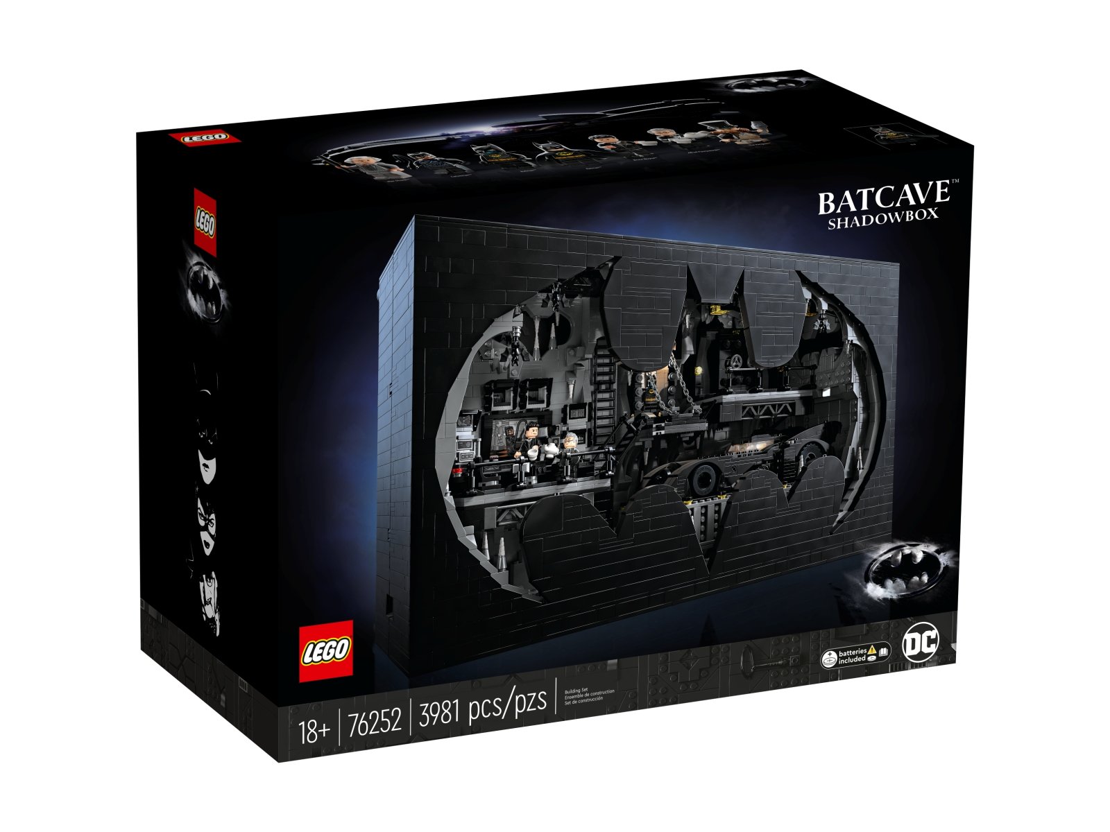 Mierząca 51 cm scenka z Jaskinią Batmana zawiera wiele autentycznych detali, w tym ruchome elementy, którymi można sterować z tyłu. Można obracać fotel, zmieniać ekran komputera oraz otwierać i zamykać magazyn narzędzi oraz oświetlić skarbiec ze strojem Batmana™. Realizmu dodaje zestawowi Batmobil z różnymi funkcjami oraz siedem minifigurek: Max Shreck, Pingwin™, Kobieta-Kot™, dwie wersje Batmana, Alfred Pennyworth™ i Bruce Wayne™. Dla większej wygody w aplikacji LEGO Builder można znaleźć cyfrową wersję instrukcji.