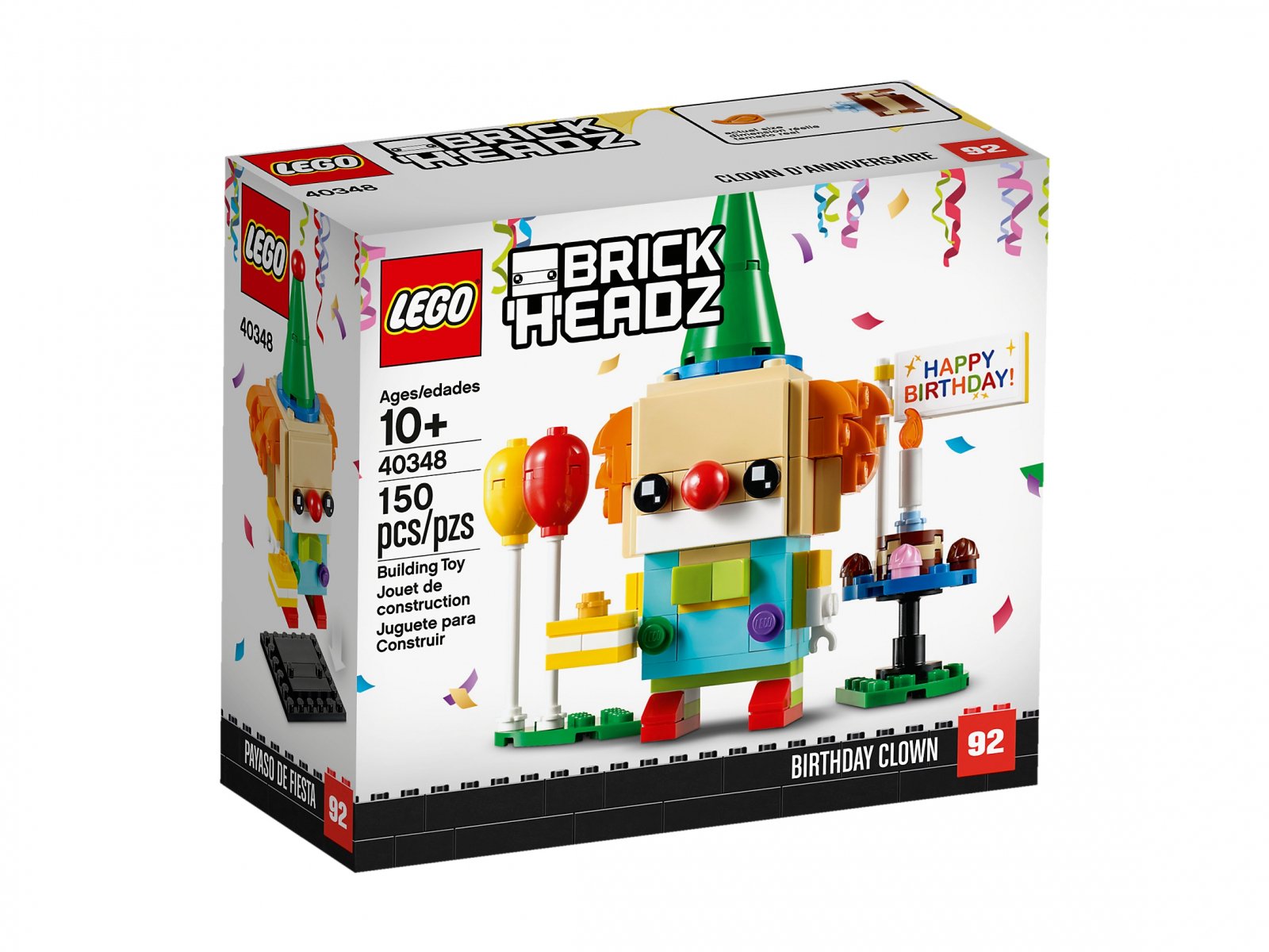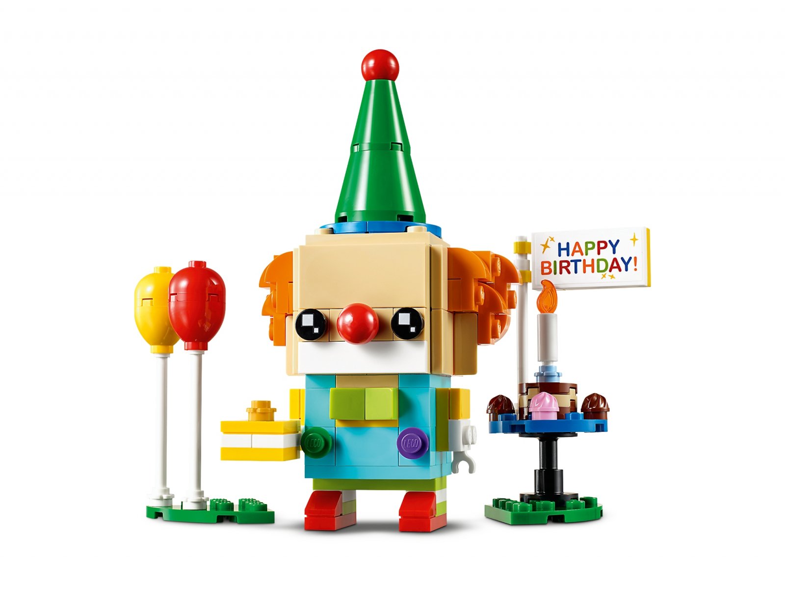 - Urodzinowy klaun w wersji LEGO® BrickHeadz™ ma oczy typowe dla zabawek z tej serii oraz wszystkie detale, które można zobaczyć u prawdziwego klauna: kolorowe ubranie, pomarańczowe włosy, wysoki kapelusz, 2 baloniki, prezent, chorągiewkę z życzeniami i tort ze świeczką.