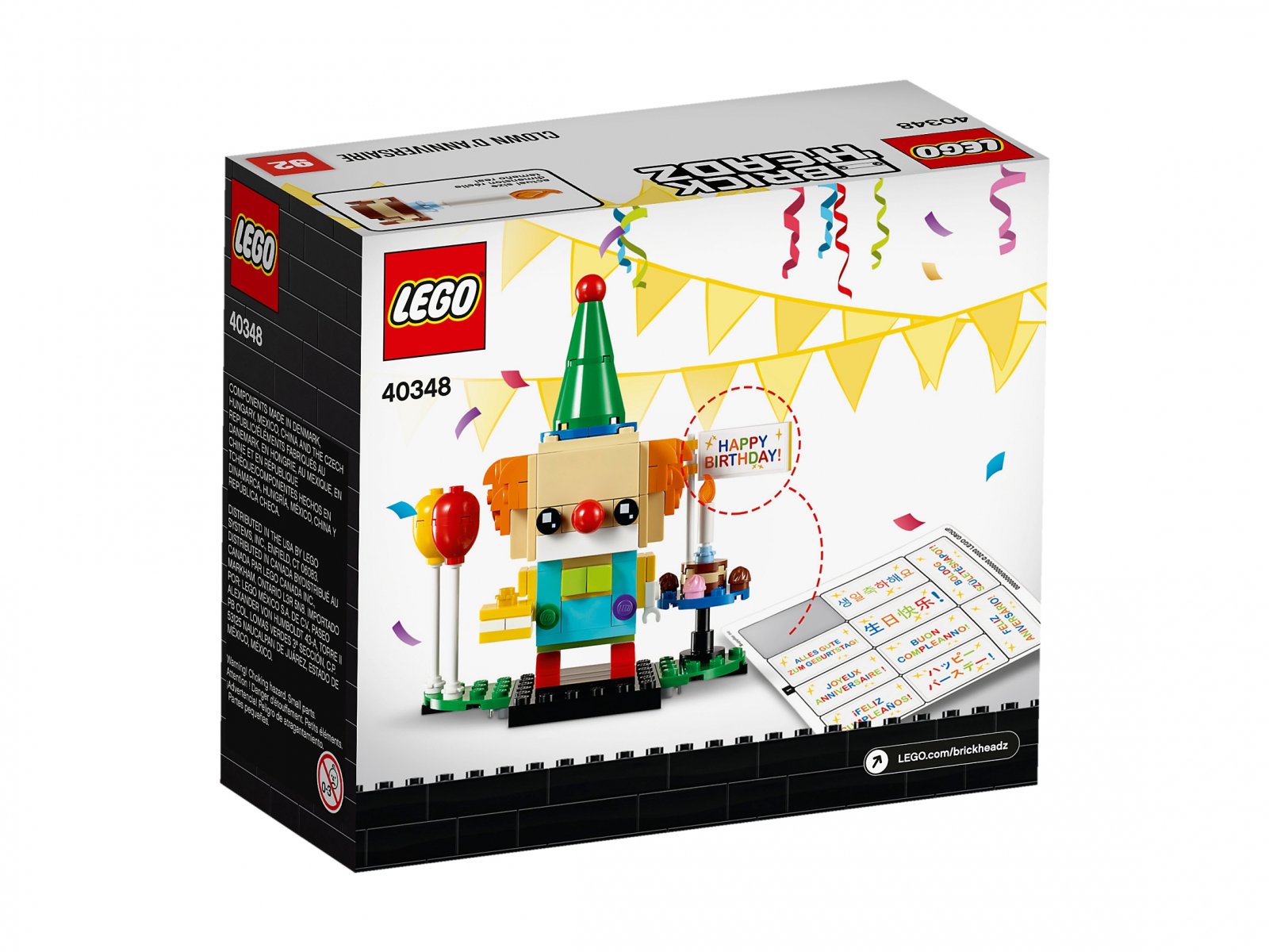 Klaun z urodzinowego przyjęcia z zestawu 40348 LEGO® BrickHeadz™ sprawi, że każde urodziny będą wyjątkowe. Ta sympatyczna postać do zbudowania ma wszystko, czego można by się spodziewać u klauna: kolorowy strój, klasyczne pomarańczowe włosy, wysoki kapelusz, 2 baloniki, prezent, chorągiewkę z życzeniami i tort ze świeczką. W zestawie znajdziesz także fajny arkusz z naklejkami, na których są życzenia „wszystkiego najlepszego z okazji urodzin” napisane w wybranych językach.