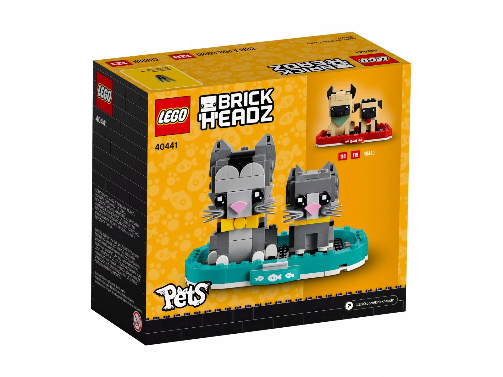 - Kolekcjonerski zestaw konstrukcyjny z zabawnymi modelami LEGO® BrickHeadz™ kota krótkowłosego i kociątka, które siedzą w koszu.