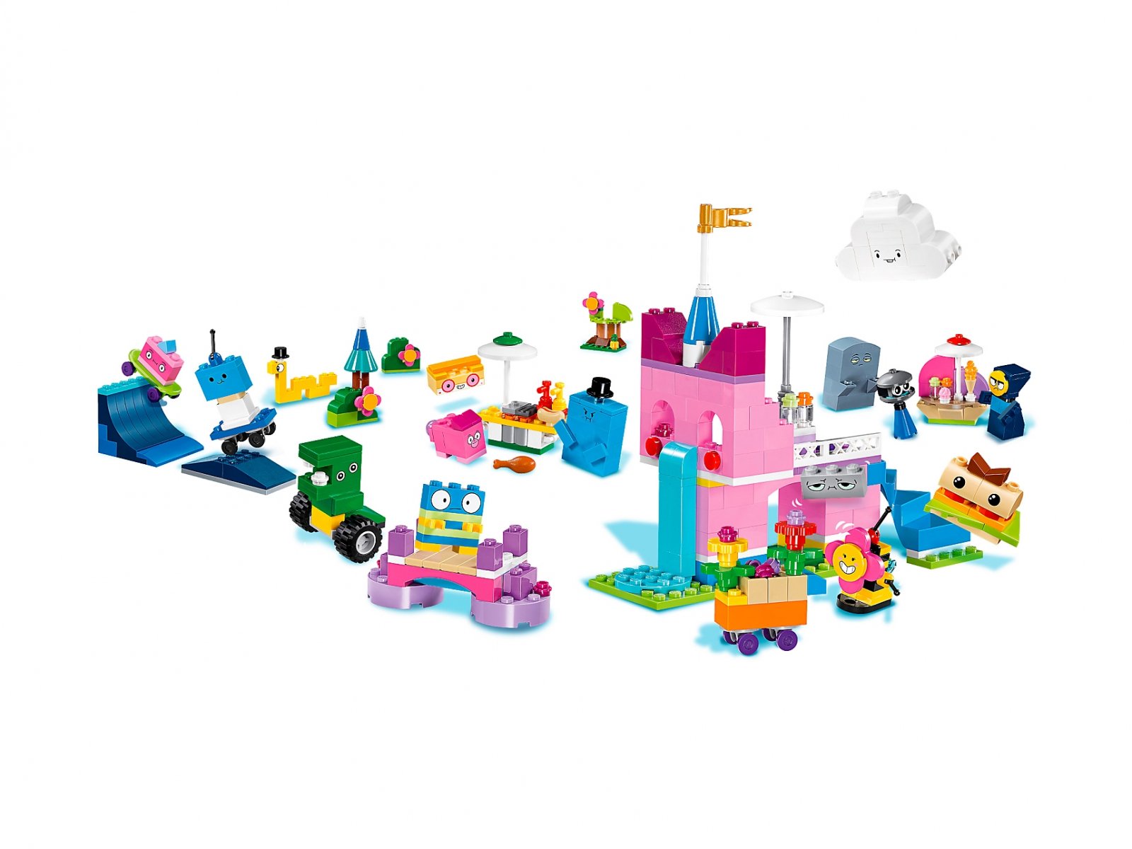 - Do zbudowania jest kilka modeli scenerii, takich jak zamek Kici Rożek, skatepark, targ z wózkiem sprzedawcy kwiatów oraz stoiskiem z hot dogami.