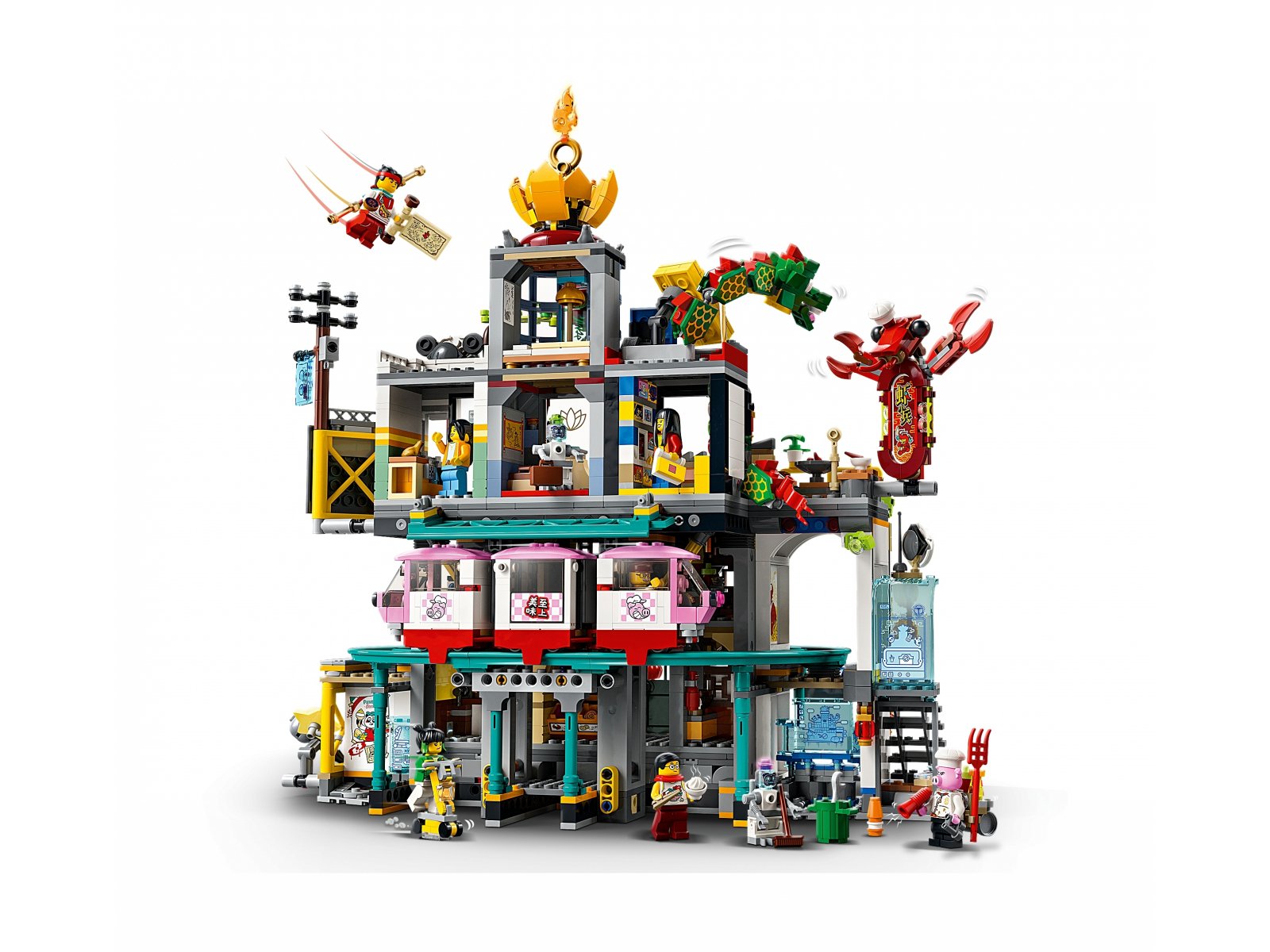 - Siedem minifigurek LEGO® sprawia, że miasto tętni życiem — Monkie Kid w stroju turysty, Mr. Tang, Mei, Pigsy, Han, Huang, maszynista oraz miejskie roboty A05 i A16 do zbudowania, a także wiele akcesoriów