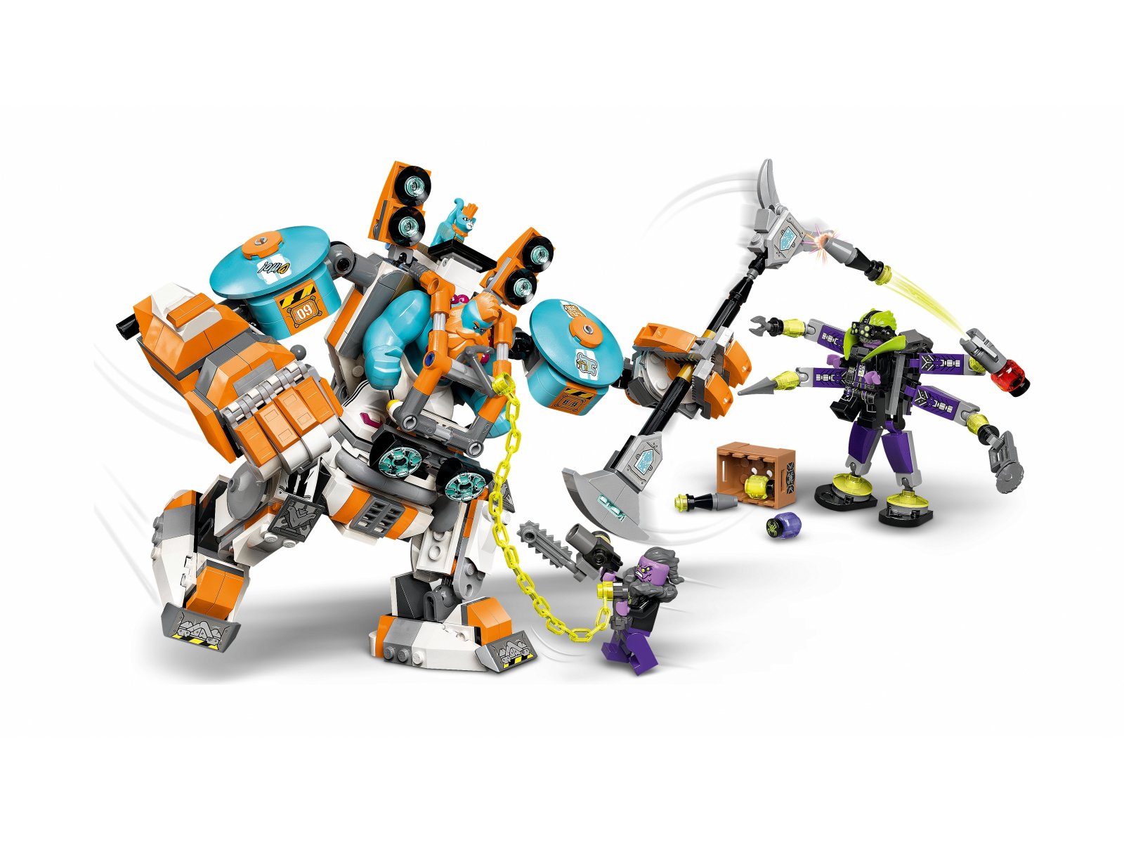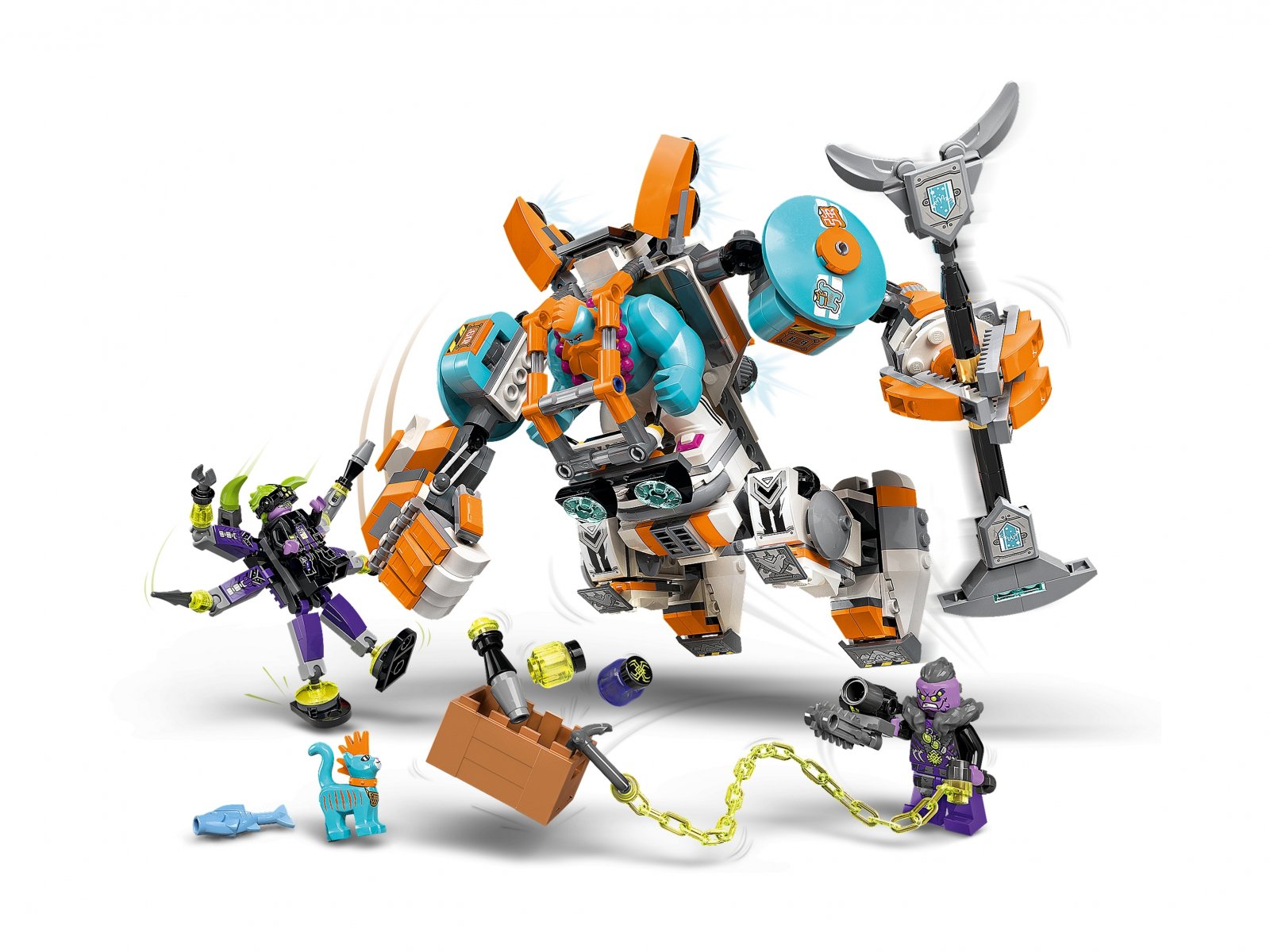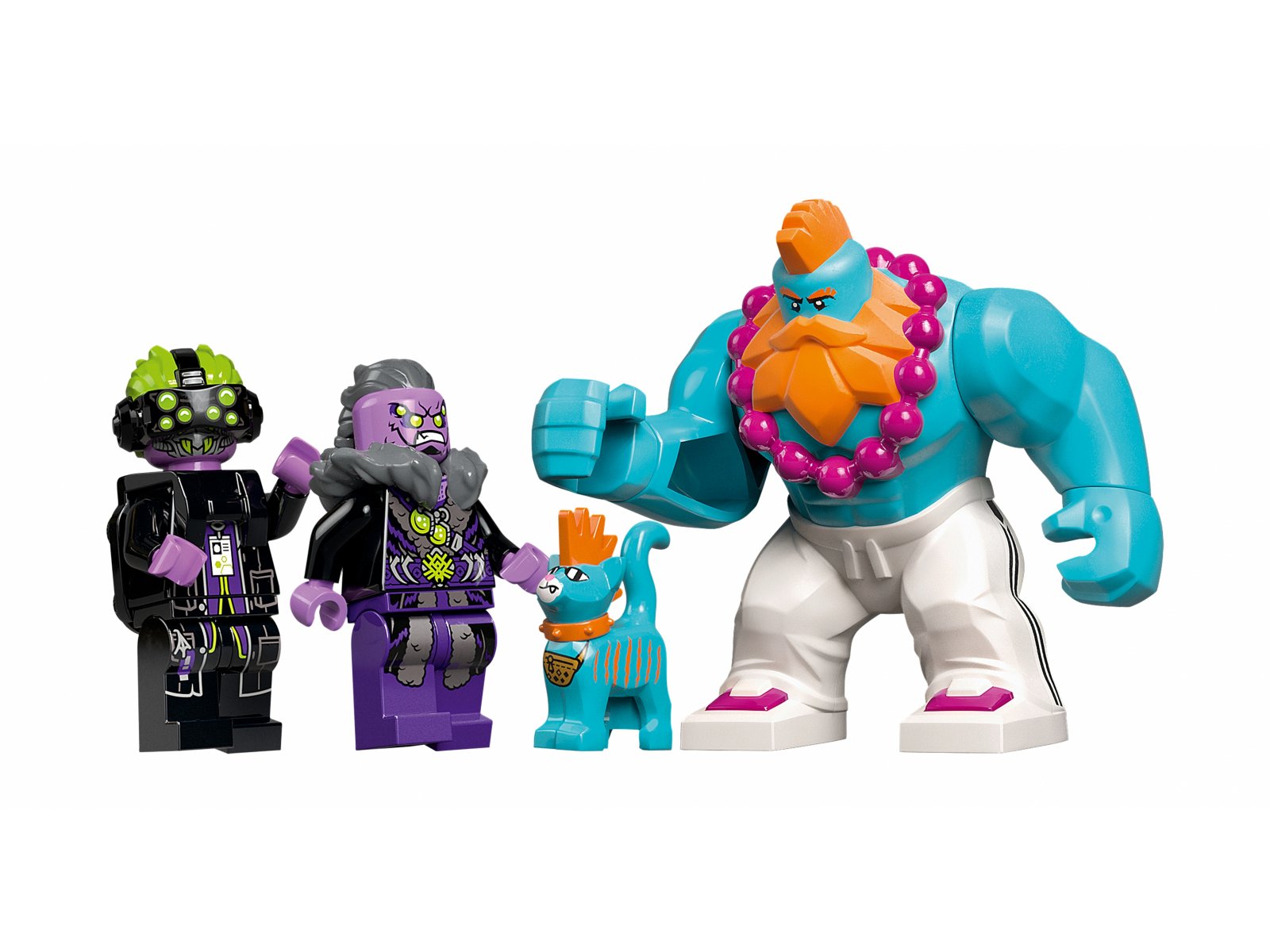 - Ten wysokiej jakości zestaw konstrukcyjny zawiera dużą figurkę Sandy’ego, figurkę kota Mo oraz dwie minifigurki: Syntaxa i Huntsmana z blasterem łańcuchowym i wyrzutnią liny z hakiem.