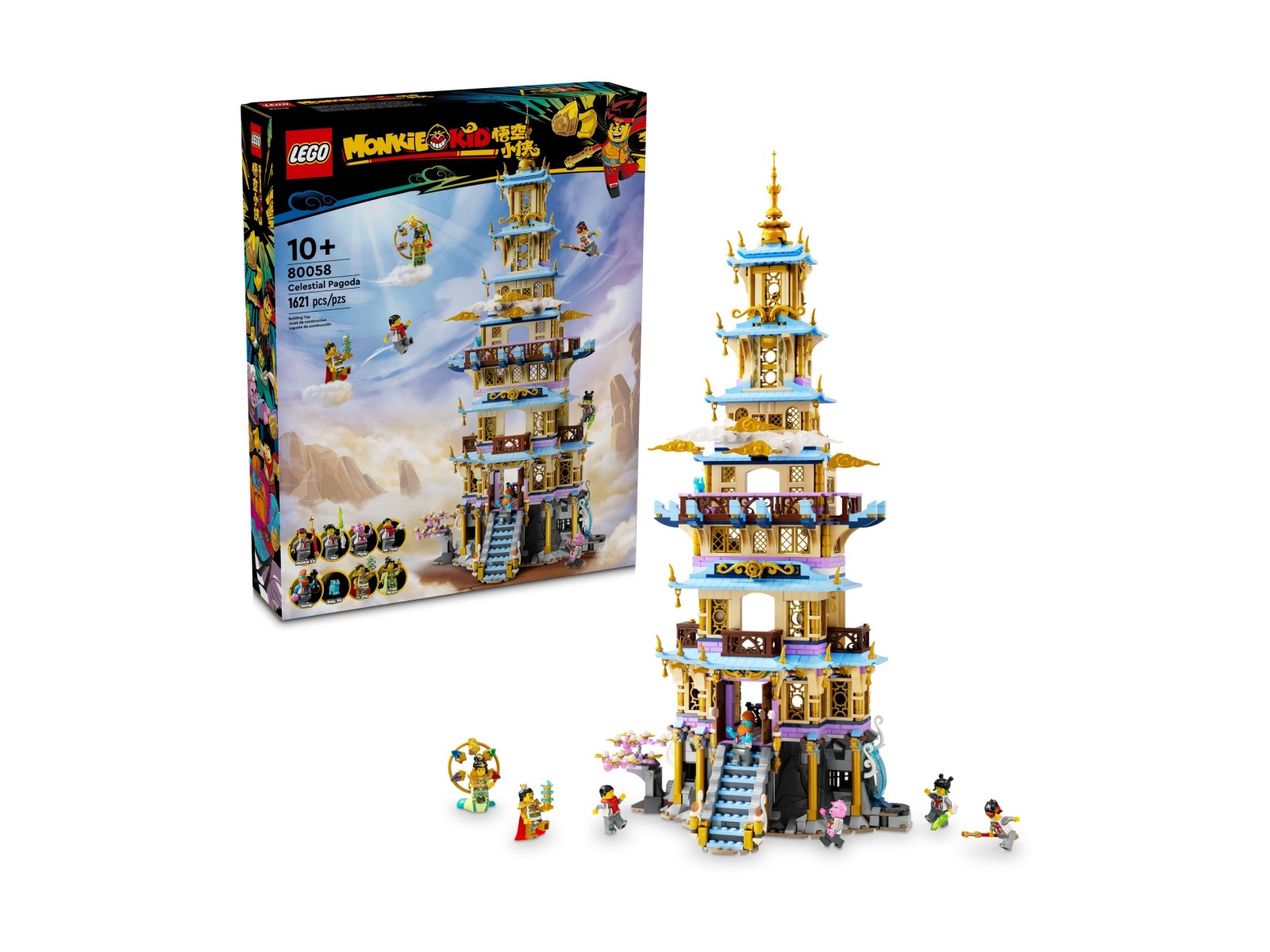 Zaskocz fanów legend i dzieci w wieku od 10 lat szczegółowym zestawem LEGO® Monkie Kid™ Niebiańska pagoda (80058), który stanowi dobrą okazję do wspólnego, rodzinnego budowania. Zawiera on pagodę z sześcioma poziomami podzielonymi na cztery sekcje, w tym więzienie, bibliotekę, szczegółowy tron w sali tronowej, salę w wieży z uchwytem na kolorowy kamień i wiele więcej. W zestawie jest siedem minifigurek: Nüwa (z nakryciem głowy z kolorowym kamieniem), Monkie Kid, Mei, Pigsy, Pan Tang, Sandy, Li Jing i kot Mały Mo.