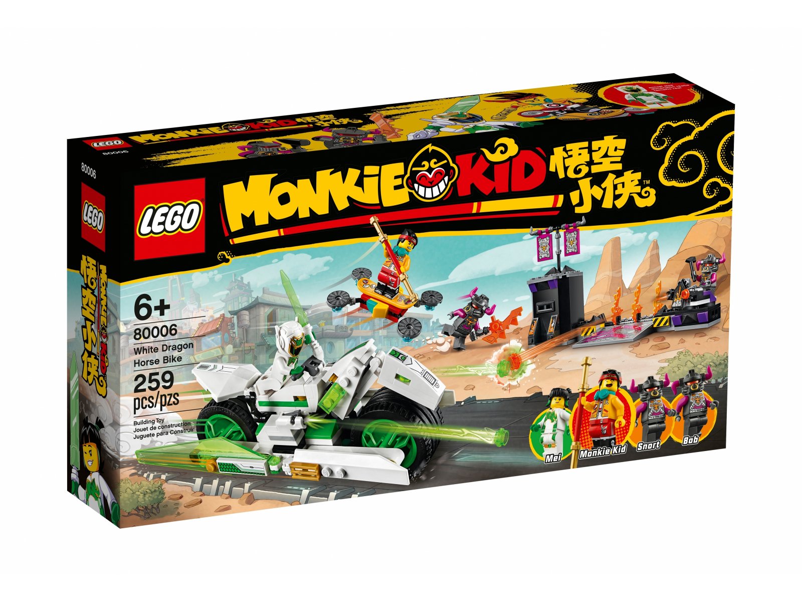 - W zestawie LEGO® Monkie Kid™ (80006) na Twojego małego bohatera czeka supernowoczesny Motocykl Biały Smok Mei, a także kryjówka Byczych Klonów oraz chmurkowa deska Monkie Kida do zbudowania. Pomóż mu przeżyć nieliczone przygody!