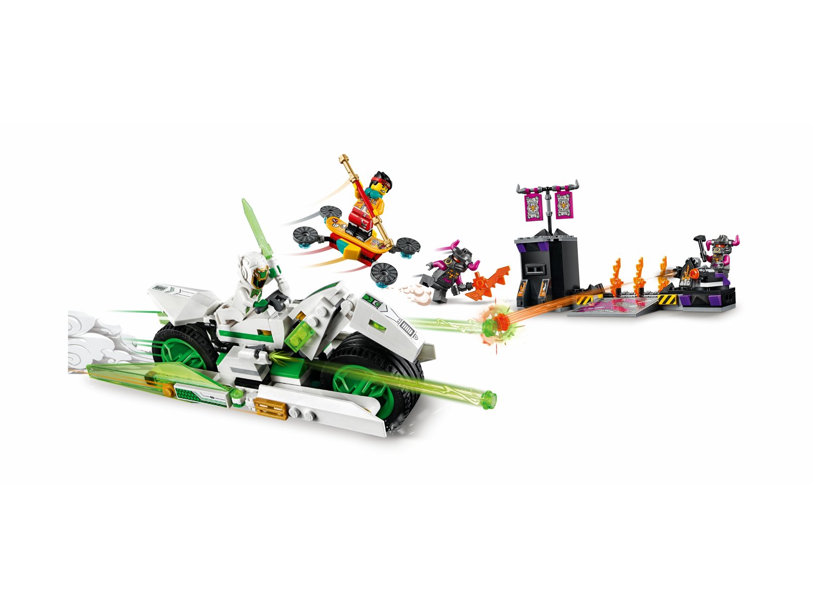 Podaruj dzieciom ekscytujący zestaw LEGO® Monkie Kid™ Motocykl Biały Smok (80006), by mogły wcielać się w bohaterów walczących z Byczymi Klonami. Liczne funkcje zapewnią dzieciakom długie godziny świetnej zabawy — w zestawie jest między innymi zabawkowy motocykl LEGO z rozkładanymi skrzydłami i działkami, więzienie z kryjówki Byczych Klonów, „płonąca” brama oraz wyrzutnie klocków, a do tego chmurkowa deska Monkie Kida. Każda z czterech minifigurek jest również uzbrojona, więc zabawa będzie naprawę dynamiczna.