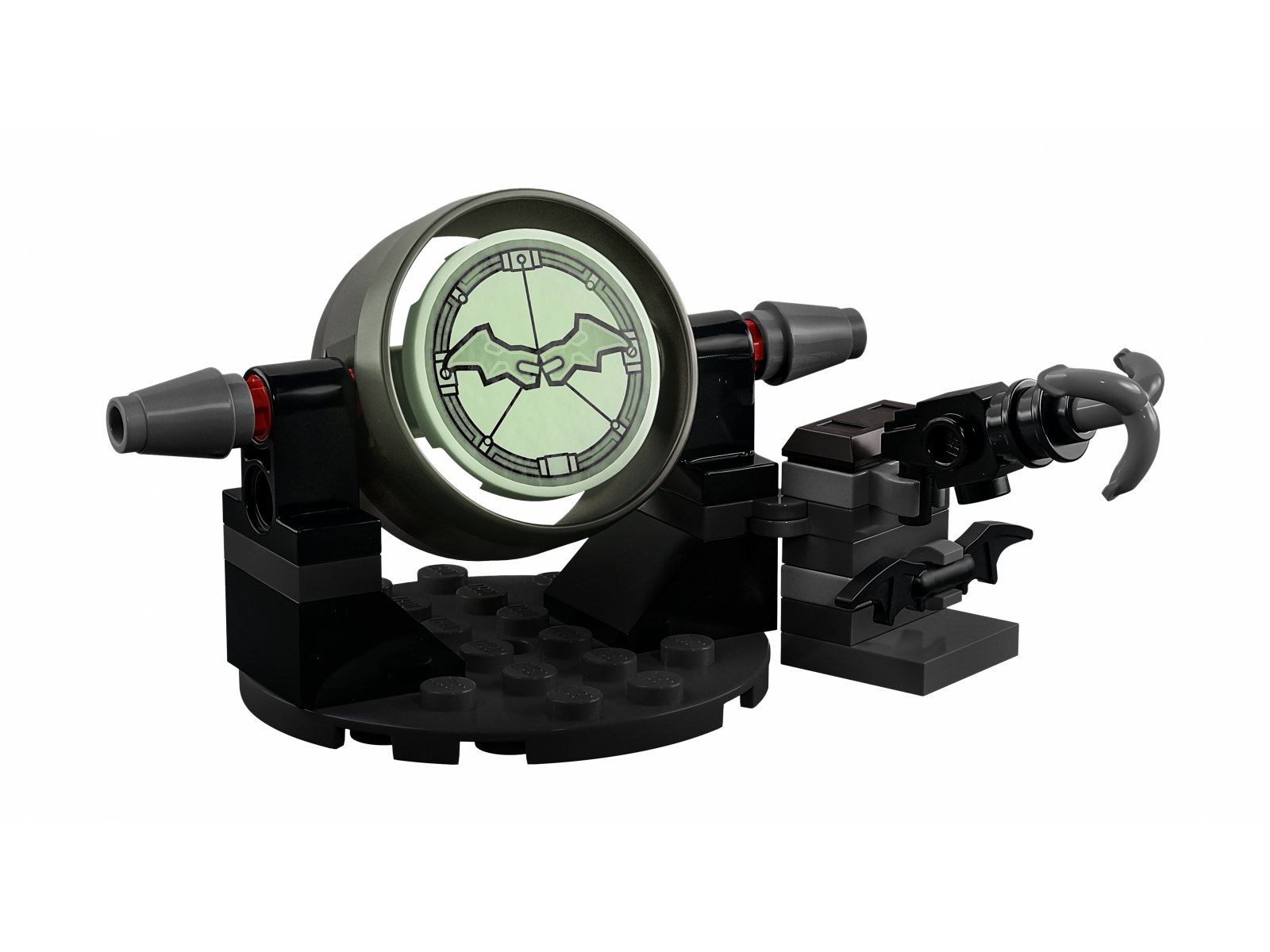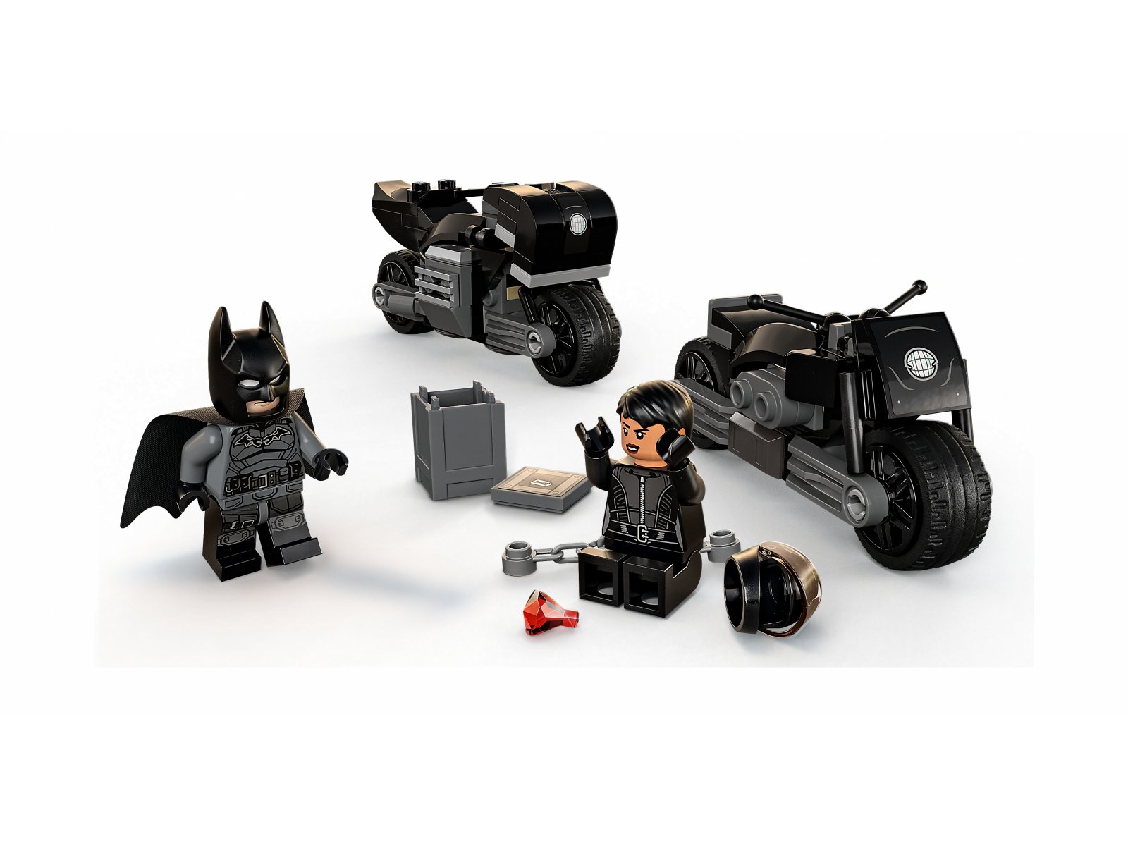 - Dwie minifigurki — Batman™ w płaszczu z materiału oraz Selina Kyle™, a do tego Batarang™, miotacz liny z hakiem, łańcuch, klejnot i świecący w ciemności sygnał wzywający Batmana