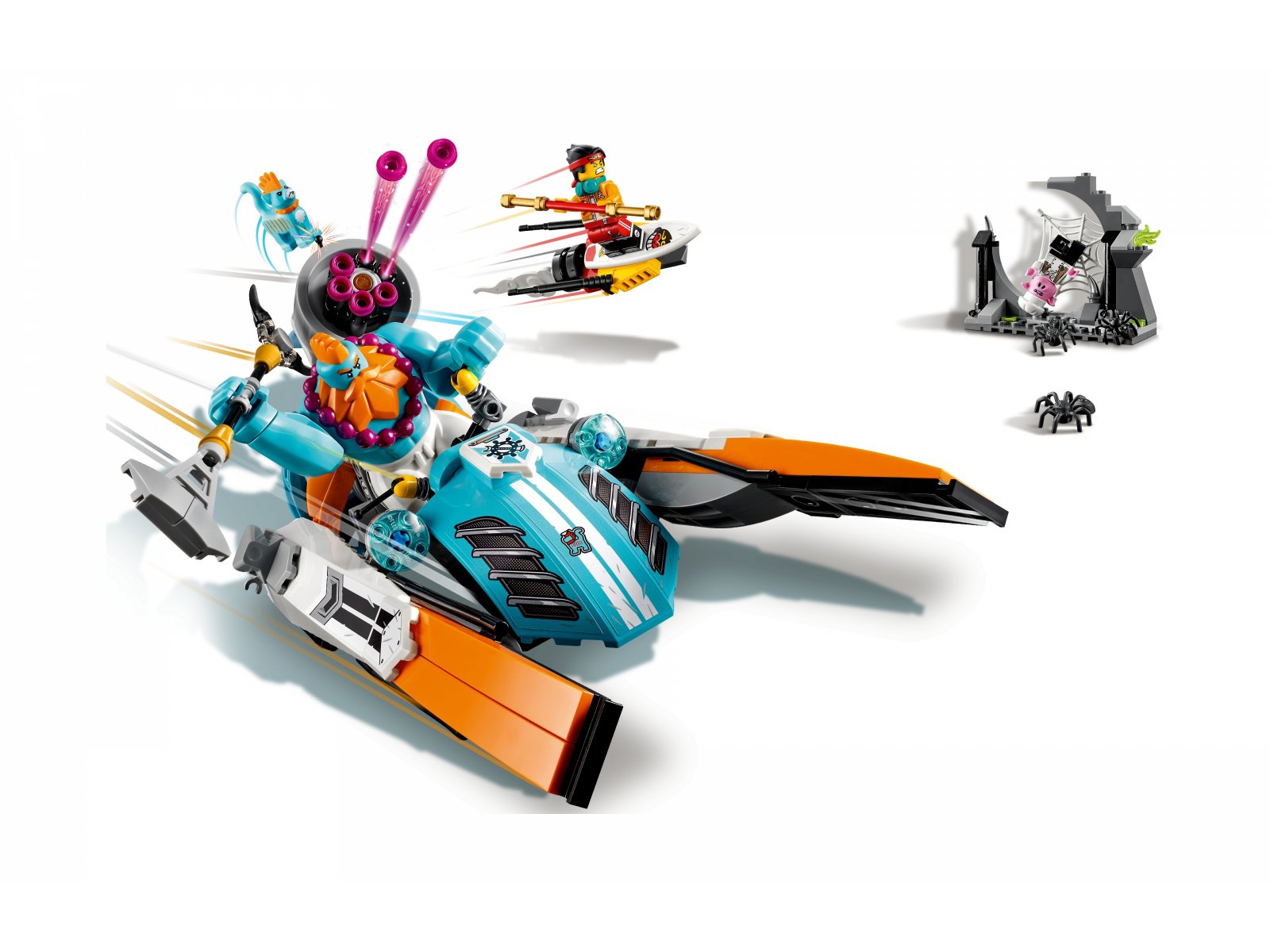 - W pudełku dzieci znajdą wiele inspirujących elementów, takich jak zamontowane na motorówce szybkostrzelne działko na sześć klocków, kręcąca się śruba, przedział dla kota lub na amunicję i pajęczynowa pułapka, w którą wpada Pigsy. Z tyłu mecha jest otwierany schowek na trzy pająki.