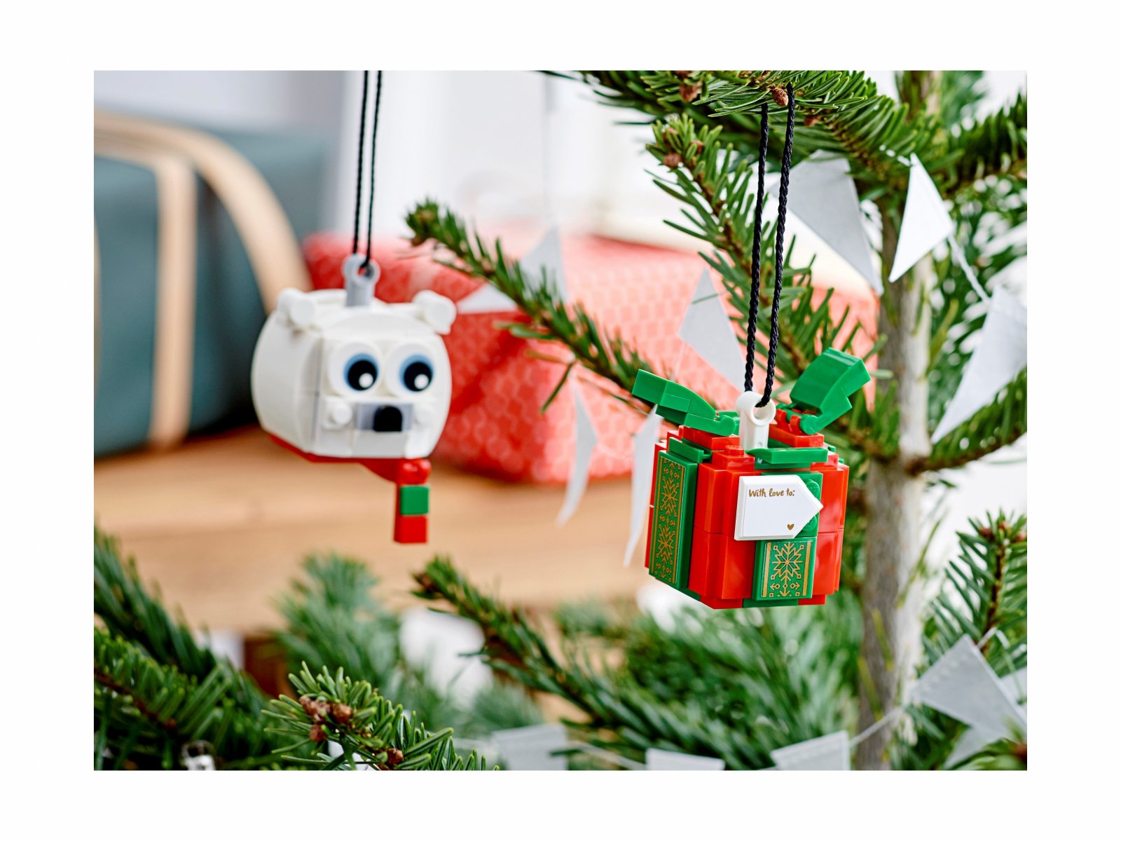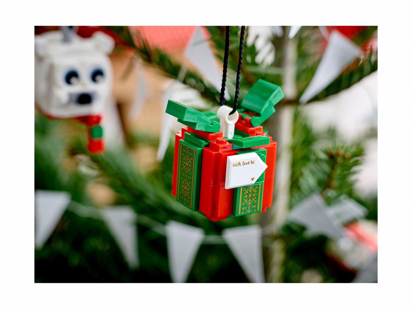 - W zestawie LEGO® Niedźwiedź polarny i pudełko z prezentem (40494) dzieci znajdą słodkiego polarnego misia z czerwono-zielonym szalikiem, a także prezent do zbudowania z klocków z ruchomymi wstążkami, złotymi naklejkami i karteczką do podpisania oraz sznurki do zawieszania modeli.