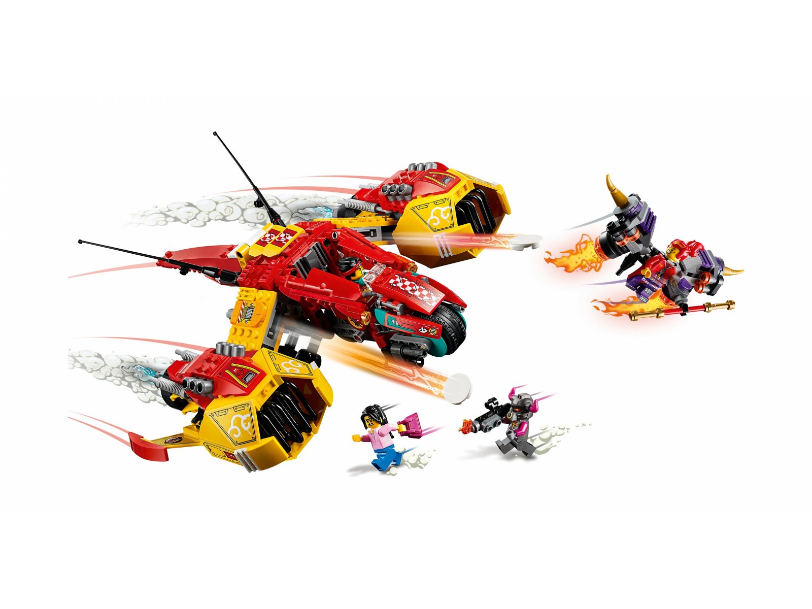- Odrzutowiec ma ruchome skrzydła z dwoma miotaczami dysków, wielki podwójny silnik odrzutowy oraz kokpit dla minifigurki Monkie Kida, który po odłączeniu zmienia się w motocykl LEGO® i pozwala przenieść walkę na ziemię.