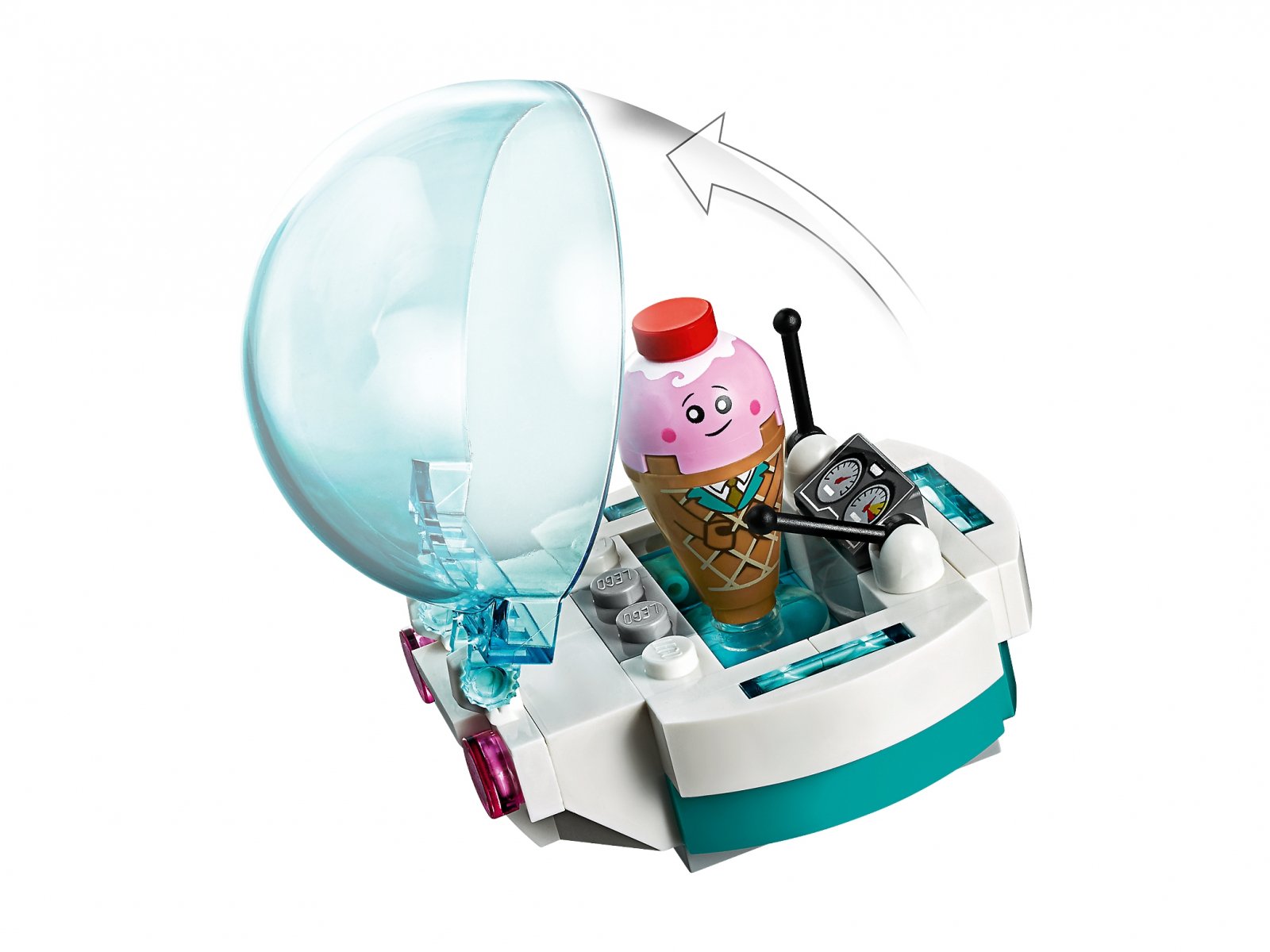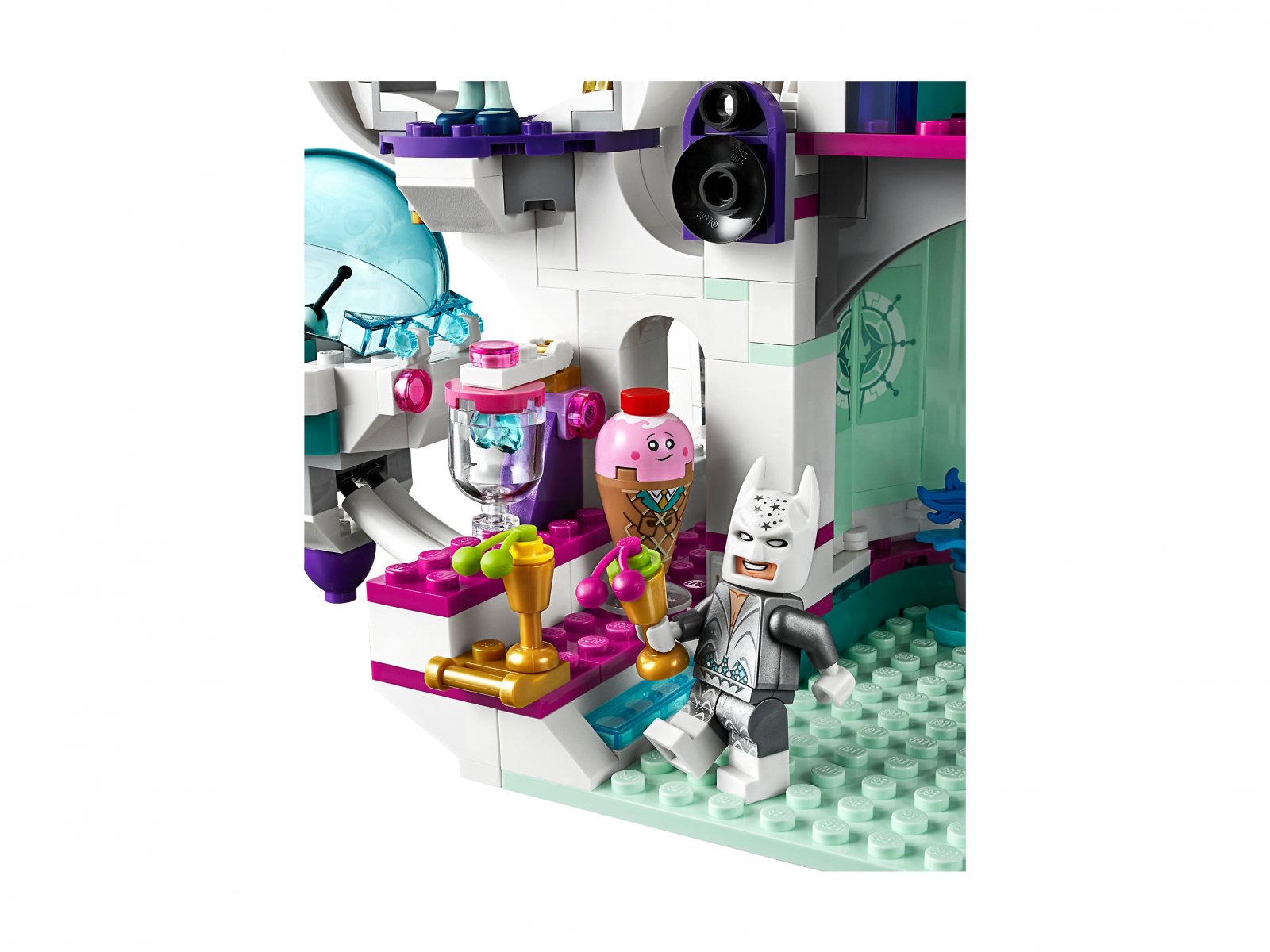 - Wielopiętrowy pałac ma na szczycie obrotową część z otwieraną i odczepianą rakietą dla Królowej Wisimi, a także odczepiane kapsuły dla innych postaci, dwa balkony, pokój strażnika i jadalnię. W pokoju strażnika znajduje się zbudowany z klocków ekran monitoringu oraz różne akcesoria, takie jak kubek kawy, małe serduszko i pączek. W jadalni natomiast znajdziesz stół, dwa krzesła, kredens, blender do koktajli zbudowany z klocków, różne potrawy i napoje oraz stanowisko DJ-a.