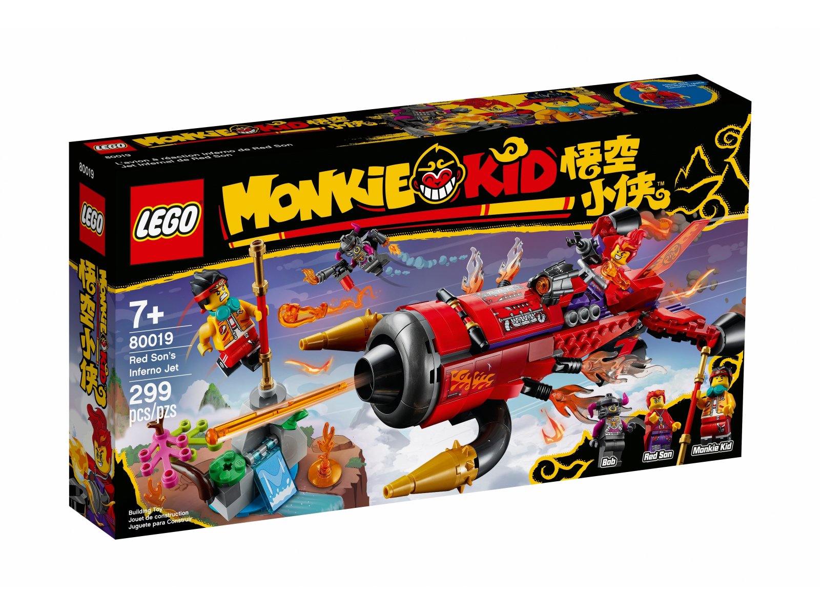 - Zestaw LEGO® Monkie Kid™ (80019) pozwala dzieciom wymyślać zabawy pełne akcji i wcielać się w bohaterskiego Monkie Kida, który broni Góry Kwiatów i Owoców przed Red Sonem atakującym z pokładu Piekielnego Odrzutowca.