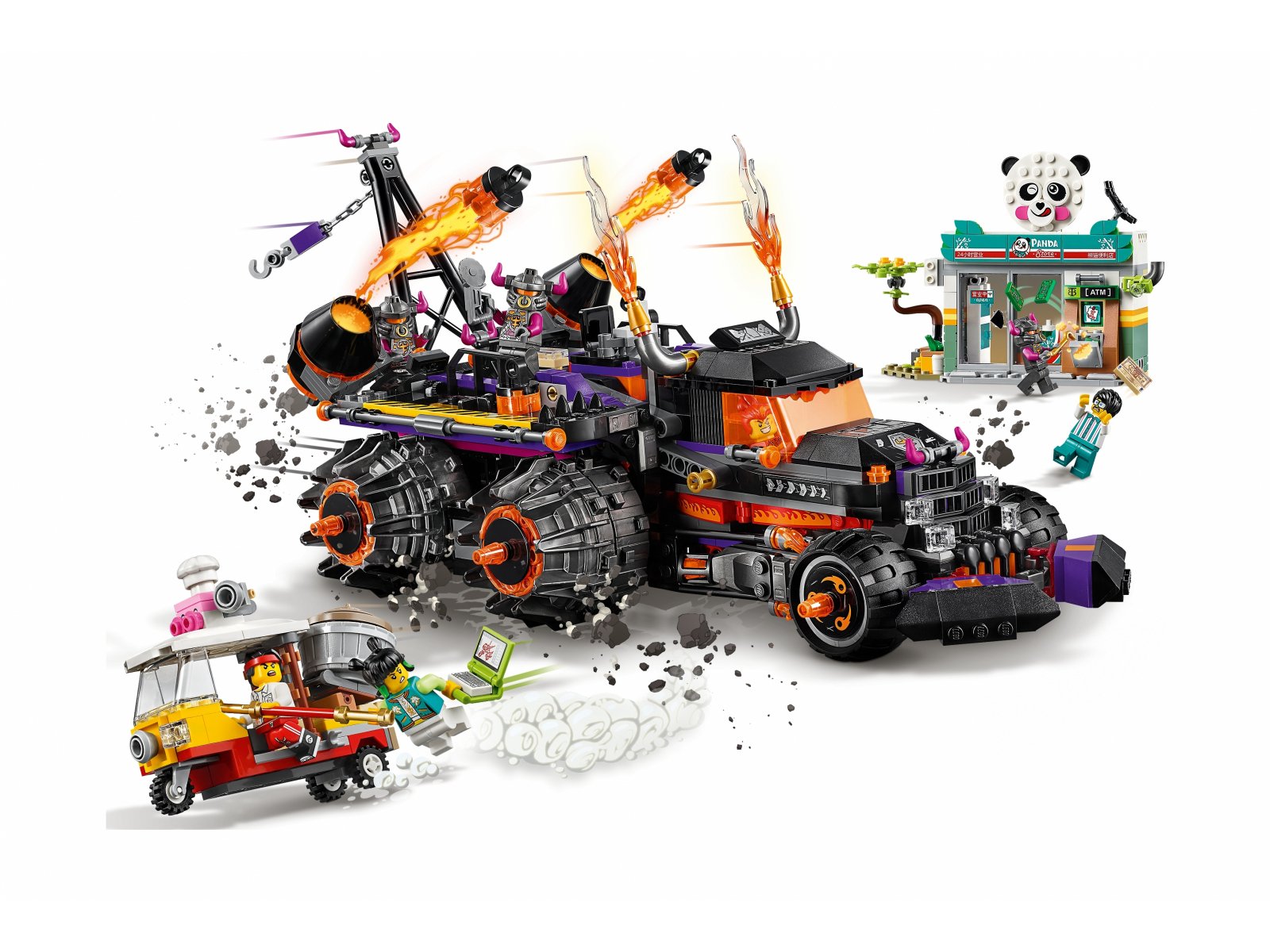 - Opancerzony pojazd ma przycisk, który uwalnia wbudowaną wyścigówkę, szybkostrzelne działko na sześć klocków oraz wyciągarkę, która pozwala wyrwać bankomat z klockowego modelu sklepu. Są tam także dwa działka strzelające „ogniwami energetycznymi”, których możesz użyć w walce z Monkie Kidem.