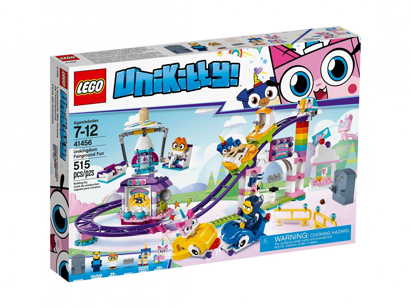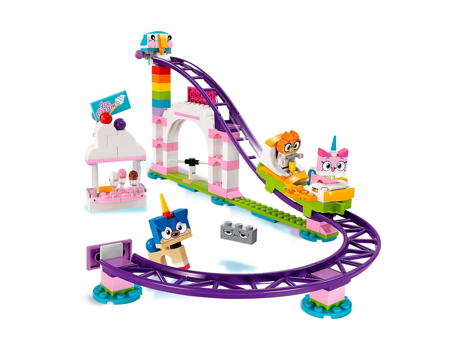 Przeżyj ponownie ulubione sceny z najbardziej radosnego, błyszczącego i kolorowego serialu telewizyjnego na antenie w zestawie LEGO® Unikitty™! 41456 Plac zabaw w Kiciorożkowie. Tutaj nie można się źle bawić — do dyspozycji masz działającą kolejkę górską, karuzelę z latającymi huśtawkami i wspaniałe samochodziki! Jest tu też sklep i dwa stoiska z przekąskami, gdzie możesz kupić coś do zjedzenia, jeśli zgłodniejesz w kolejce do atrakcji. W zestawie znajduje się pięć postaci z serialu telewizyjnego do zbudowania oraz figurka Ricka™, z którymi możesz spędzić niezapomniany dzień pełen wrażeń.