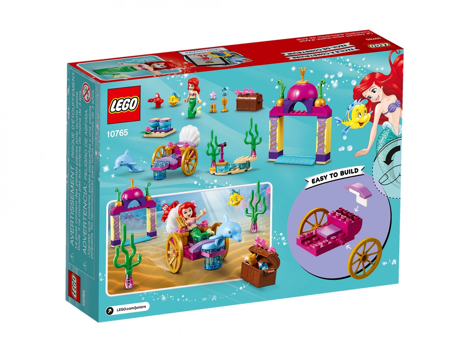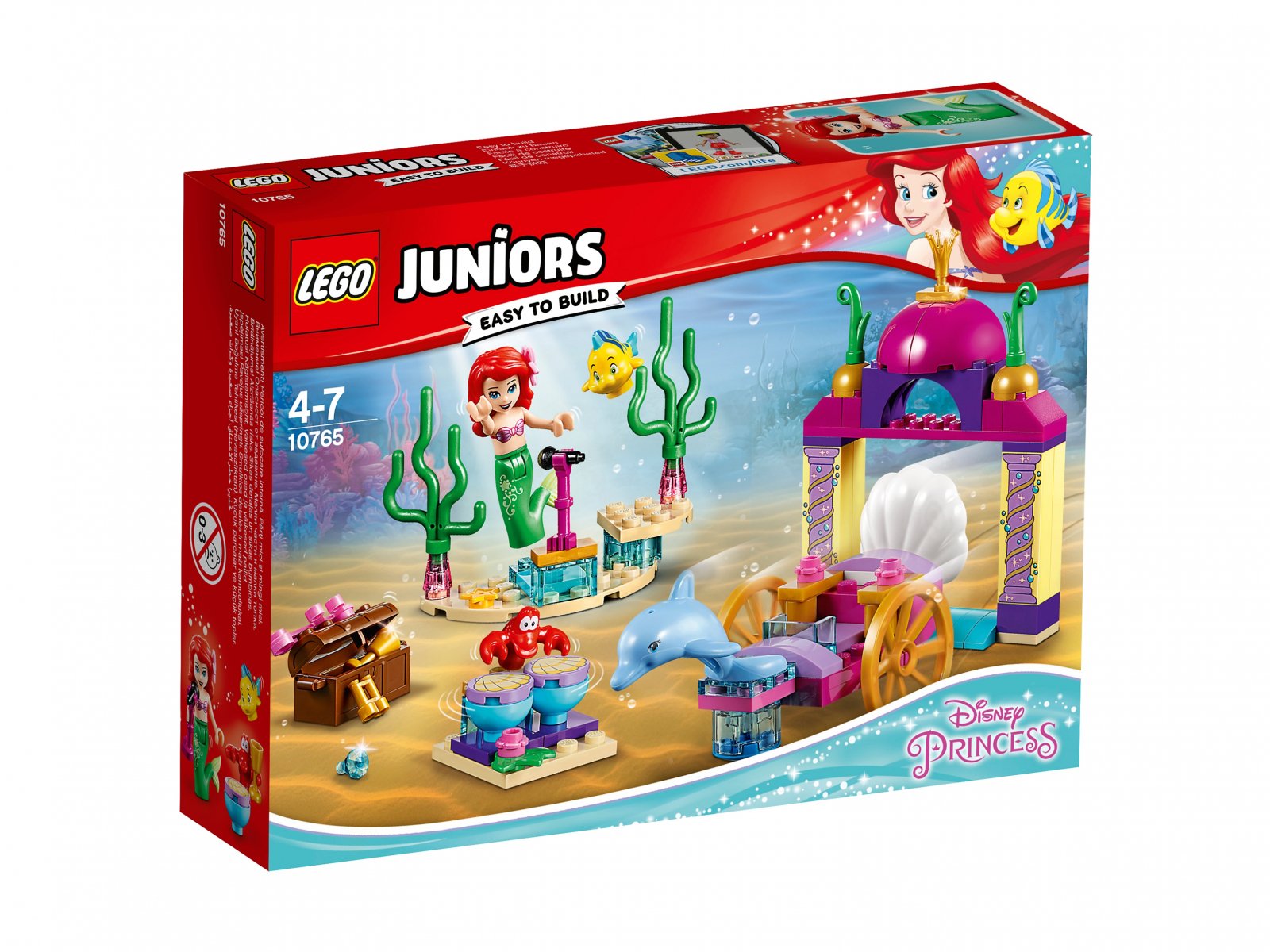 Przyjdź na występ Arielki i jej przyjaciół w zestawie LEGO® Juniors 10765 Podwodny koncert Arielki. Zwiedź podwodny świat w powozie zbudowanym na podstawce startowej. Zobacz łuk, scenę z mikrofonem na stojaku, otwieraną skrzynię ze skarbem oraz perkusję do zbudowania. Ten uroczy zestaw z filmu Disneya „Mała syrenka” zawiera proste instrukcje budowania i zabawy, które pomagają poczuć się pewniej dzieciom w wieku od 4 lat. W zestawie minilaleczka oraz figurki ryby, kraba i delfina.