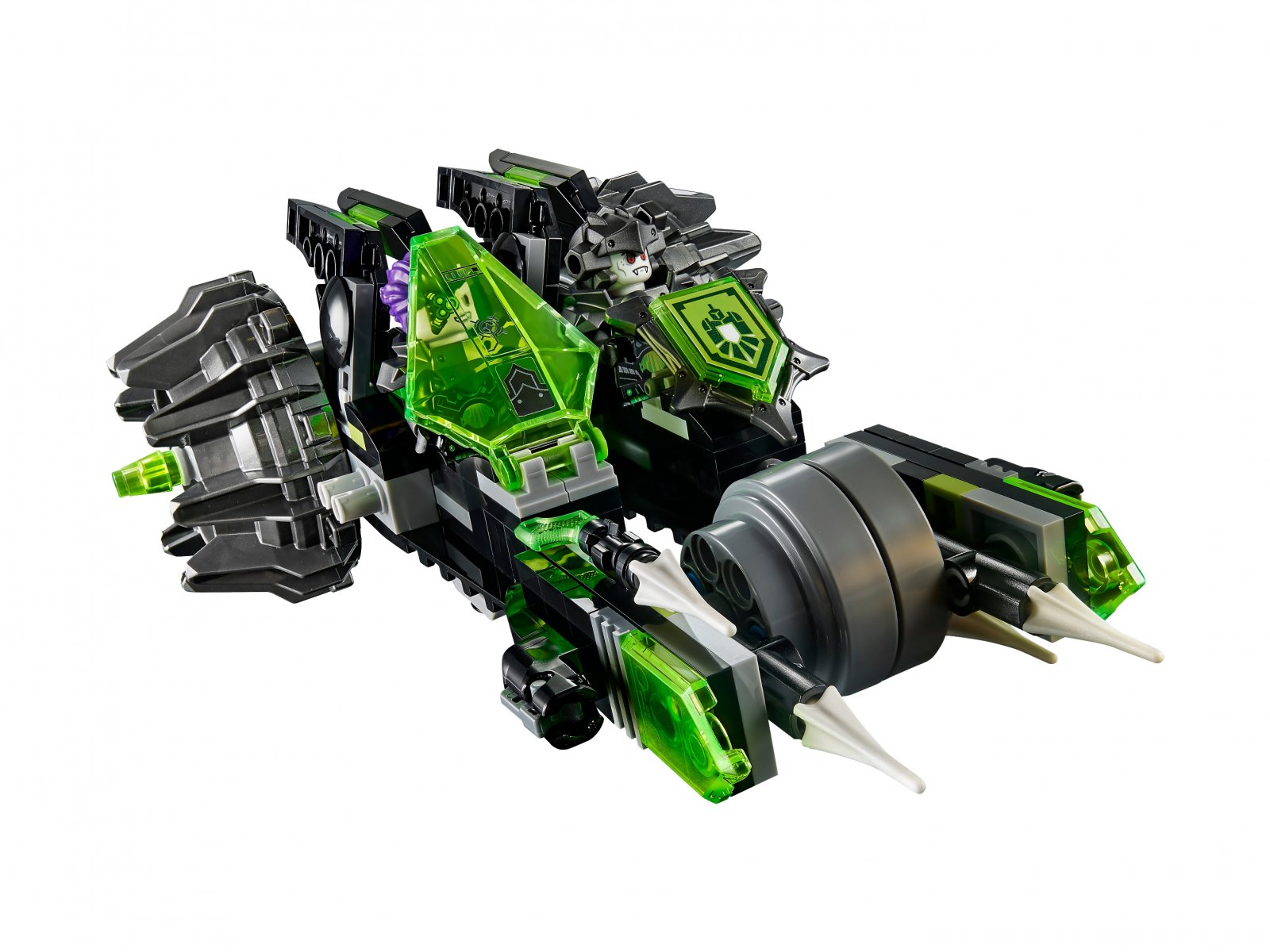 - Podwójny infektor ma dwa kokpity dla minifigurek, dwa miotacze potworków i uchwyt na tarczę.