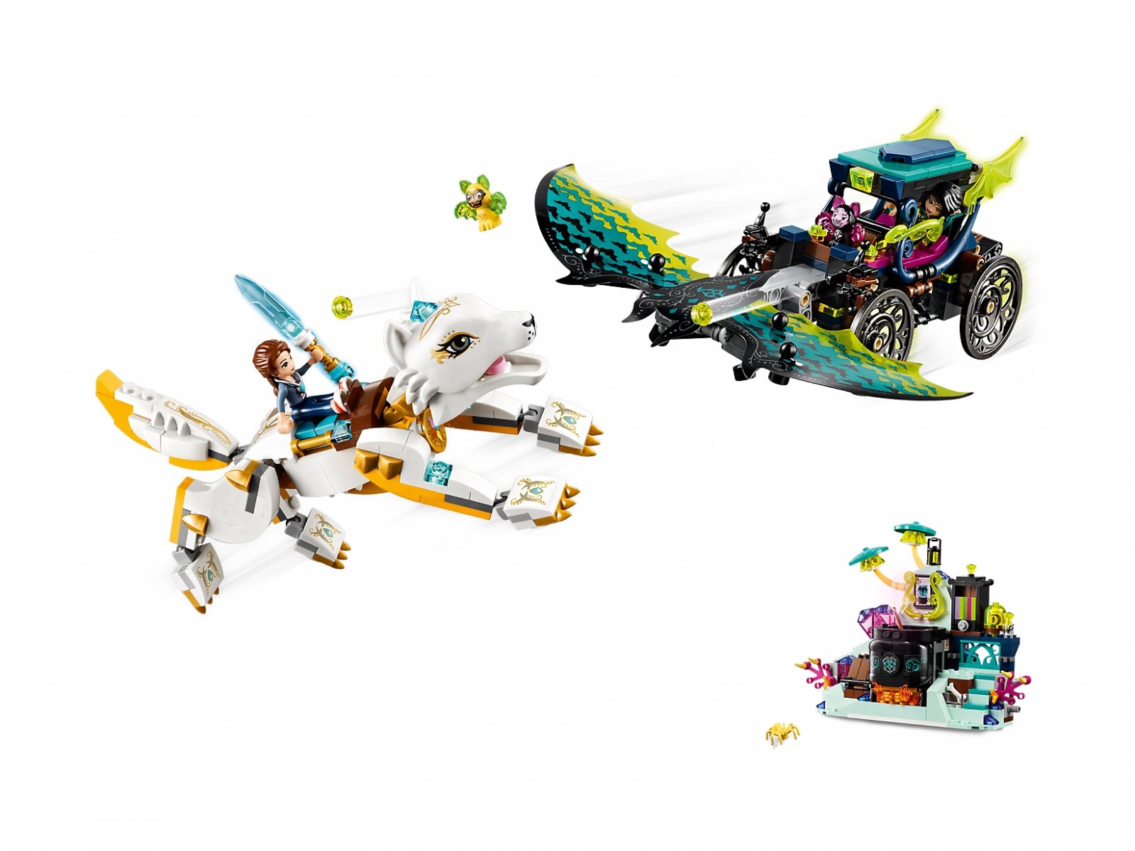 - Zestaw obejmuje karetę Noctury z ruchomymi nietoperzowymi skrzydłami, dwiema kuszami i otwieranym dachem, a także ruchomą figurkę wilczycy Lumii do zbudowania, której może dosiadać minilaleczka.