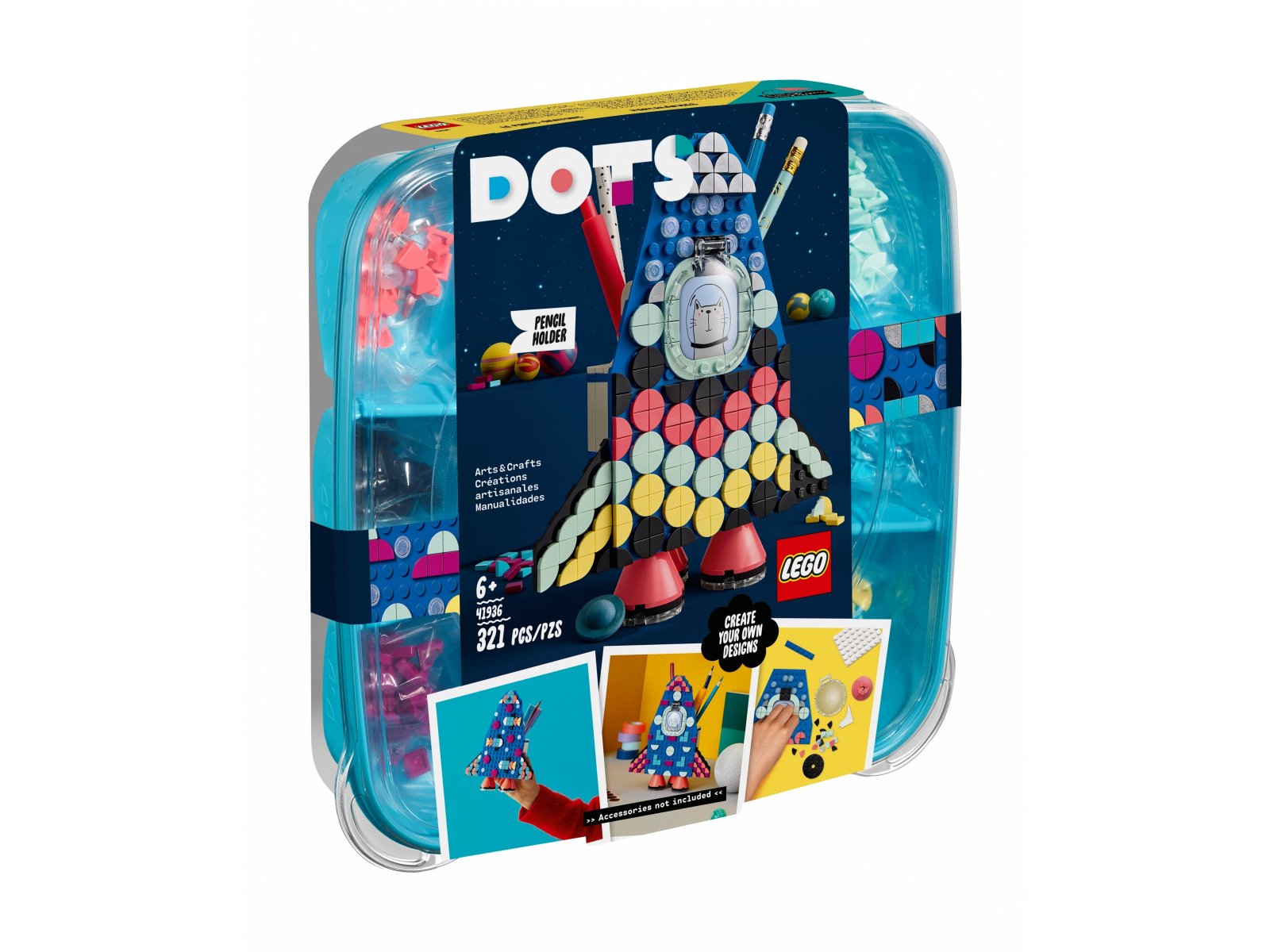 - Zestaw LEGO® DOTS Pojemnik na długopisy (41936) zachęca dzieci do kreatywnej zabawy i rozwija wyobraźnię. Ozdabianie rakiety we własny sposób pomaga rozwijać umiejętności tworzenia projektów.