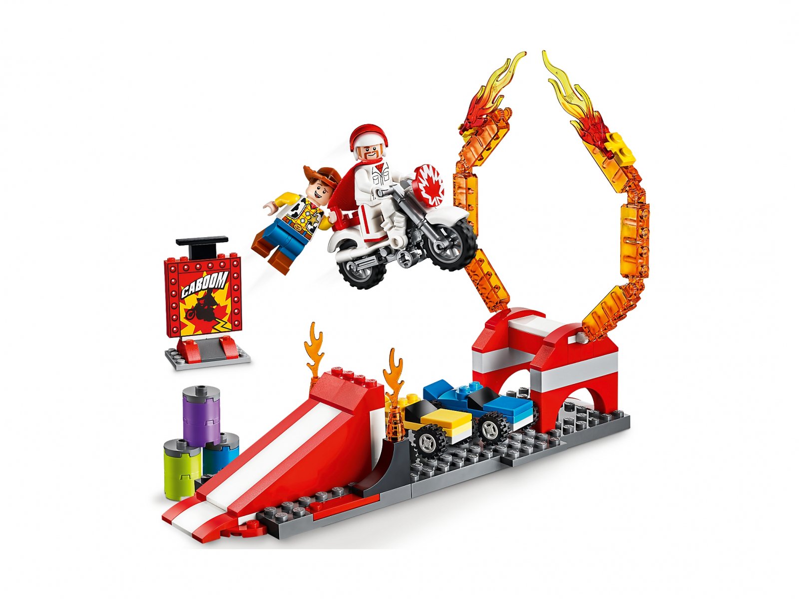 - Ten fajny zestaw zawiera płonącą obręcz i pasiastą rampę z luką, w której można ustawić samochody, a także dwie podstawki startowe, które pozwolą Twojemu dziecku szybko zabrać się do budowania z klocków LEGO® i zabawy w emocjonującym świecie filmu „Toy Story 4” wytwórni Disney
