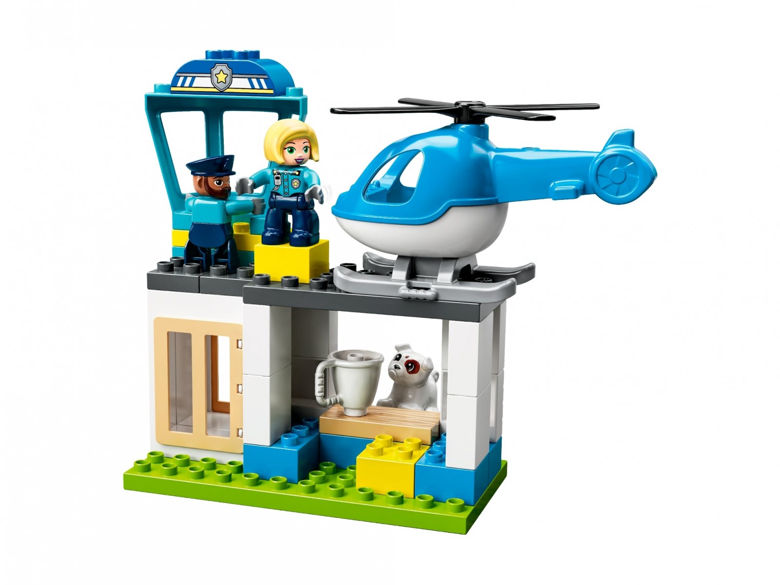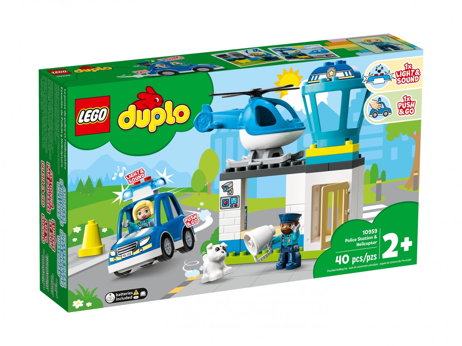 LEGO® DUPLO® Posterunek policji i helikopter (10959) to policyjny zestaw dla dwulatków i starszych dzieci, w którym znajdziesz postacie i pojazdy inspirujące najmłodszych do zabawy.