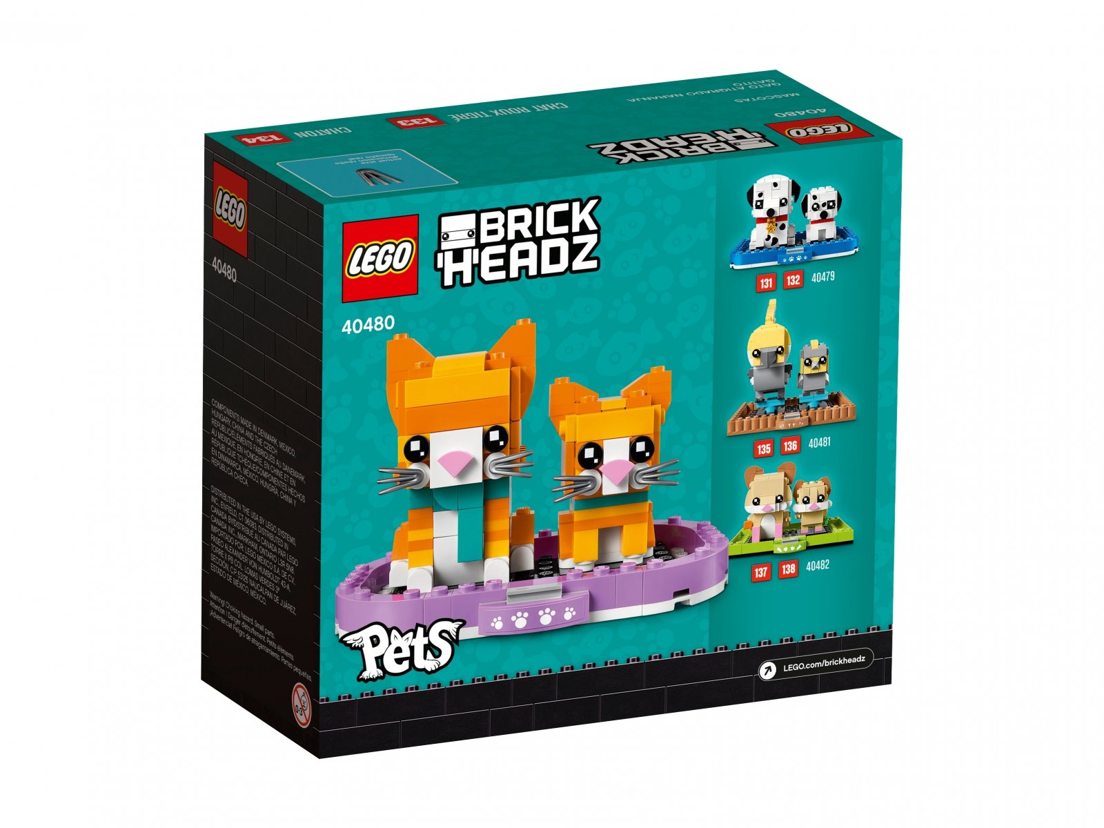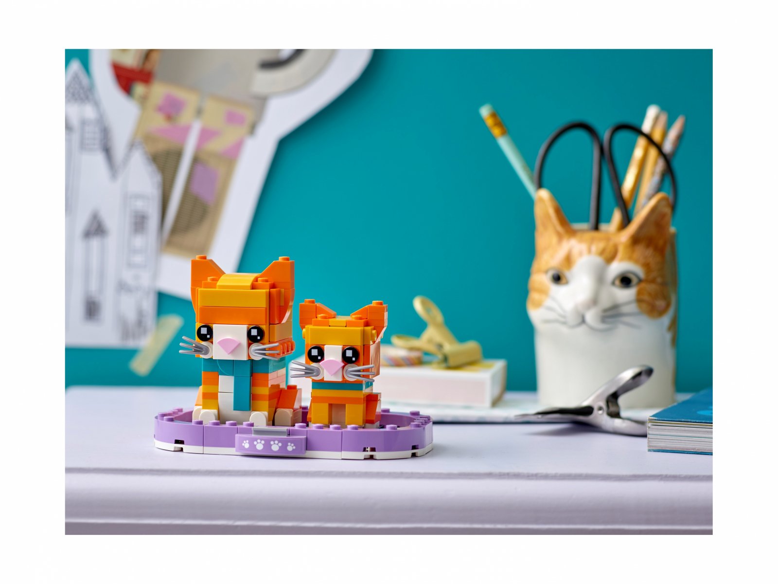 - Kolekcjonerski zestaw konstrukcyjny z zabawnymi modelami LEGO® BrickHeadz™ pręgowanego rudego kota i kociątka, które siedzą w koszu.